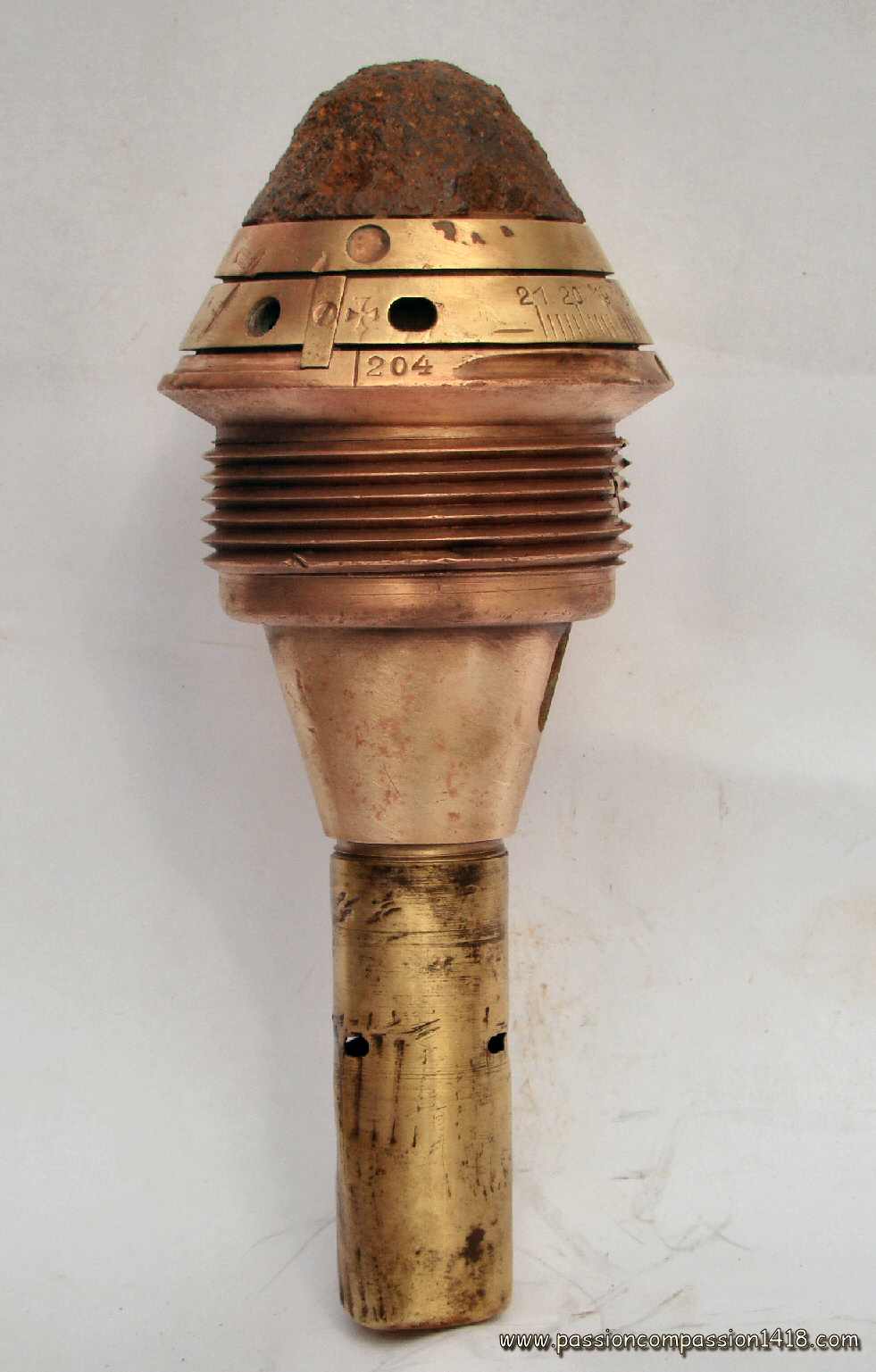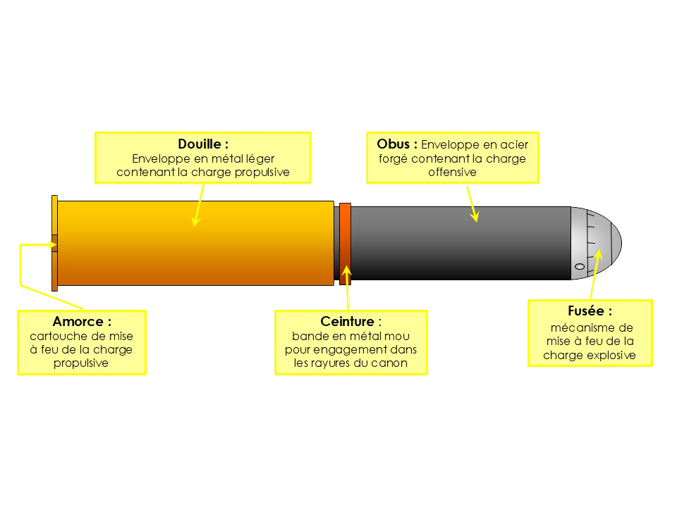 Les obus à balles constituaient en 1914 les munitions principales de l'artillerie de campagne. Destinés à exploser au-dessus des formations ennemies par l'usage d'un mécanisme de mise à feu spécifique (fusée à temps) , ils dispersaient une gerbe mortelle de fragments et de balles tout en produisant un nuage de fumée qui permettait aux artilleurs de régler leur tir.