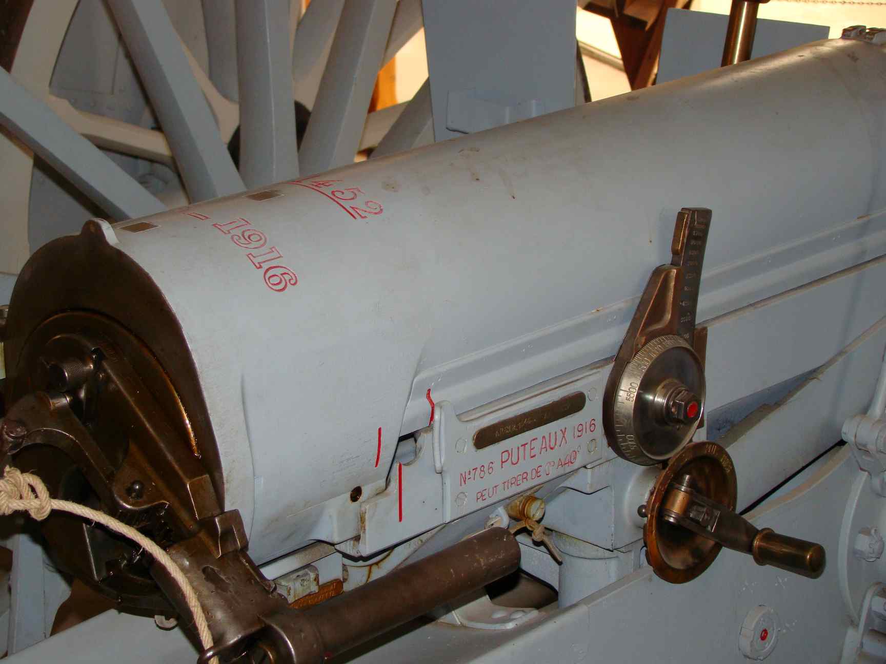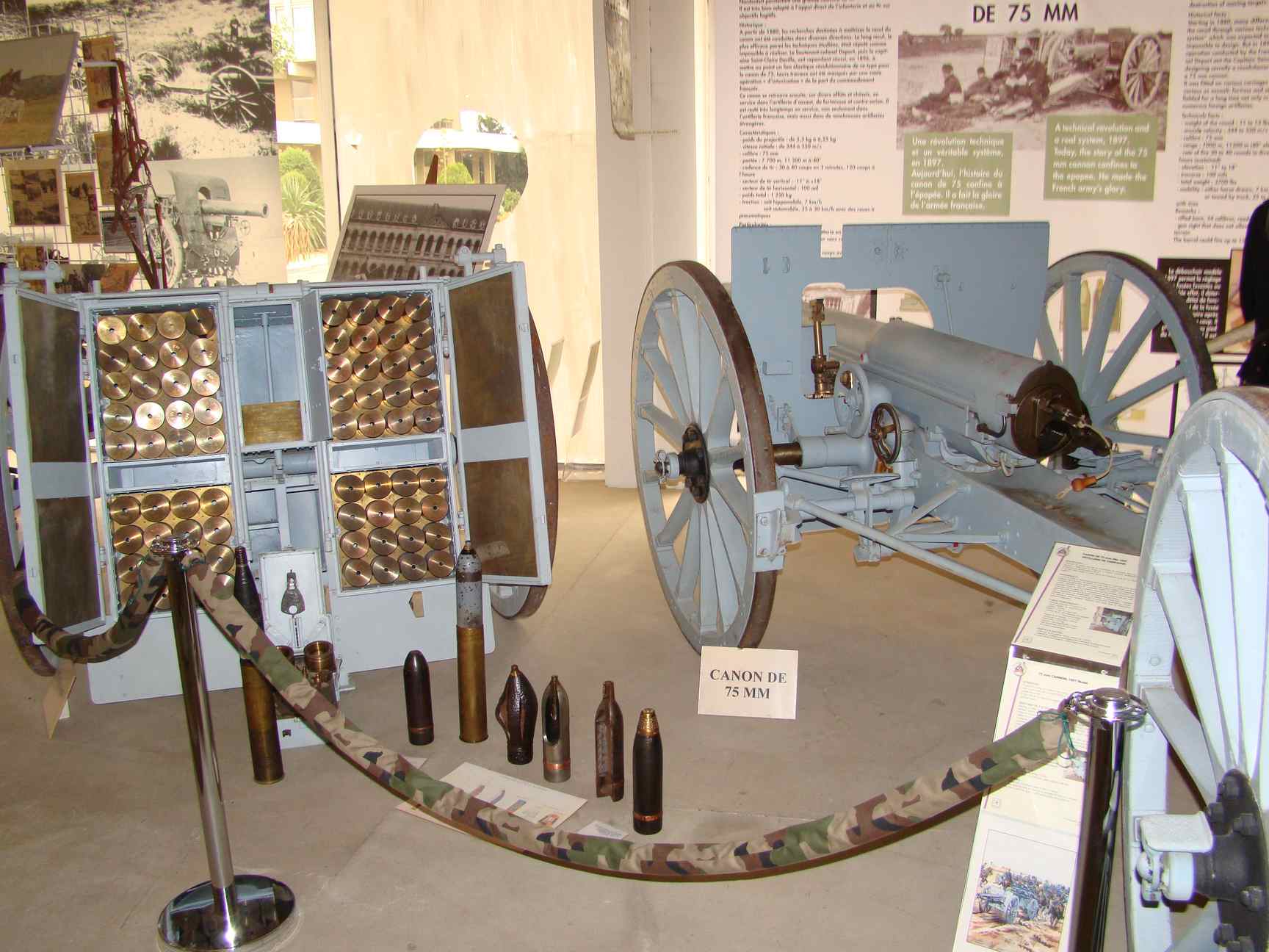 Présenté au public en 1899, et tirant ses premiers obus en opération en Chine en 1900 devant les nations Européennes ébahies, le 'glorieux 75' séduisit tant l'Etat-Major et le gouvernement Français qu'ils en vinrent à considérer que cette seule pièce 'suffit à toutes les missions qui peuvent être confiées a l'artillerie dans la guerre de campagne'. Cette certitude, alliée à la doctrine d'offensives à outrance pronée par les militaires et aux contraintes budgétaires, amenèrent la nation à se désintéresser notoirement de la modernisation de son artillerie lourde de campagne, et à abandonner complètement tout projet d'obusier léger de campagne. Ceci devait avoir de très fâcheuses conséquences dès août 1914 : même si le canon de 75 confirma pendant tout le conflit sa redoutable efficacité anti-personnel dans une mission d'accompagnement d'infanterie, il se montra rapidement inefficace contre les retranchements (en raison de son tir trop tendu) et dans une moindre mesure pour les préparations d'attaque (son obus explosif, quoique nettement supérieur à celui de son homologue Allemand de 77mm, manquant de puissance). De nombreuses astuces furent improvisées avant et pendant le conflit pour corriger ces défauts, dont le tir plongeant avec charge réduite, l'enterrement de la bêche et la courbure de la trajectoire par adjonction à la tête de l'obus d'une plaquette 'Malandrin' (frein aérodynamique). Ces tentatives furent autant de déceptions, souvent coûteuses en vies humaines. Comptant 4780 unités au début du conflit (dont 4080 dans des batteries disponibles pour les opérations), les effectifs de 75 baissèrent dangereusement à 3071 pièces en mai 1915 du fait des pertes de guerre et de la crise d'éclatements de tube créés par les munitions défectueuses fabriquées par des industriels de qualité diverse mobilisés en hâte. Les parcs se reconstituèrent ensuite avec les fabrications des arsenaux d'état puis aussi de l'industrie privée (dont Schneider) : on en comptait 6039 dans les Armées Françaises en novembre 1918. Des variantes furent créées en arme anti-aérienne, anti-char, pièce de côte, pièces de bord et pièces de forteresse (sous casemate de Bourges). Le 75 fut utilisé par de tres nombreux pays alliés de la France pendant la Première Guerre dont la Belgique et les USA (1828 pièces achetées), mais aussi par l'Armée Allemande qui utilisa nombre de tubes de pièces capturées pour la fabrication de canons anti-aérien. Le canon était encore la pièce de campagne de l'Armée Française en mai 1940, et participa ensuite aux combats des troupes de la France Libre en Afrique ou fut intégré dans certaines unités de la Wehrmacht. |