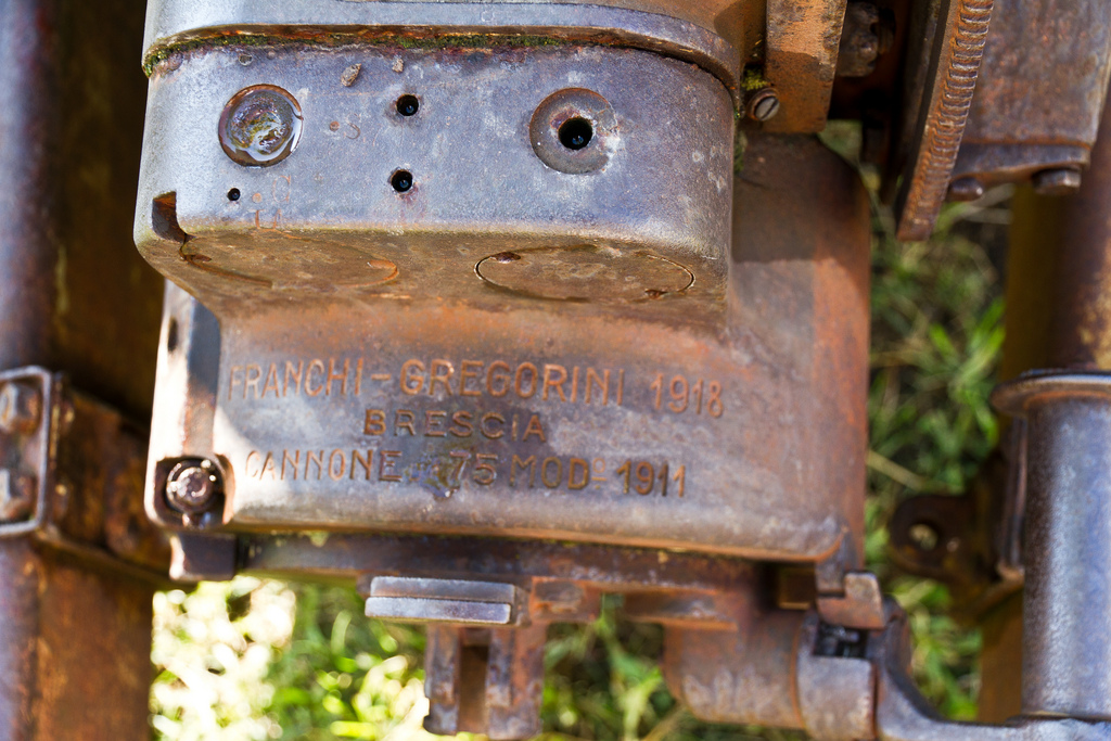 Marquages culasse : 'Franchi-Gregorini 1918 - Brescia - Cannone da 75Mod 1911' et 'Vickers Terni 1917 - Spezia - Cannone da 75Mod 1911'