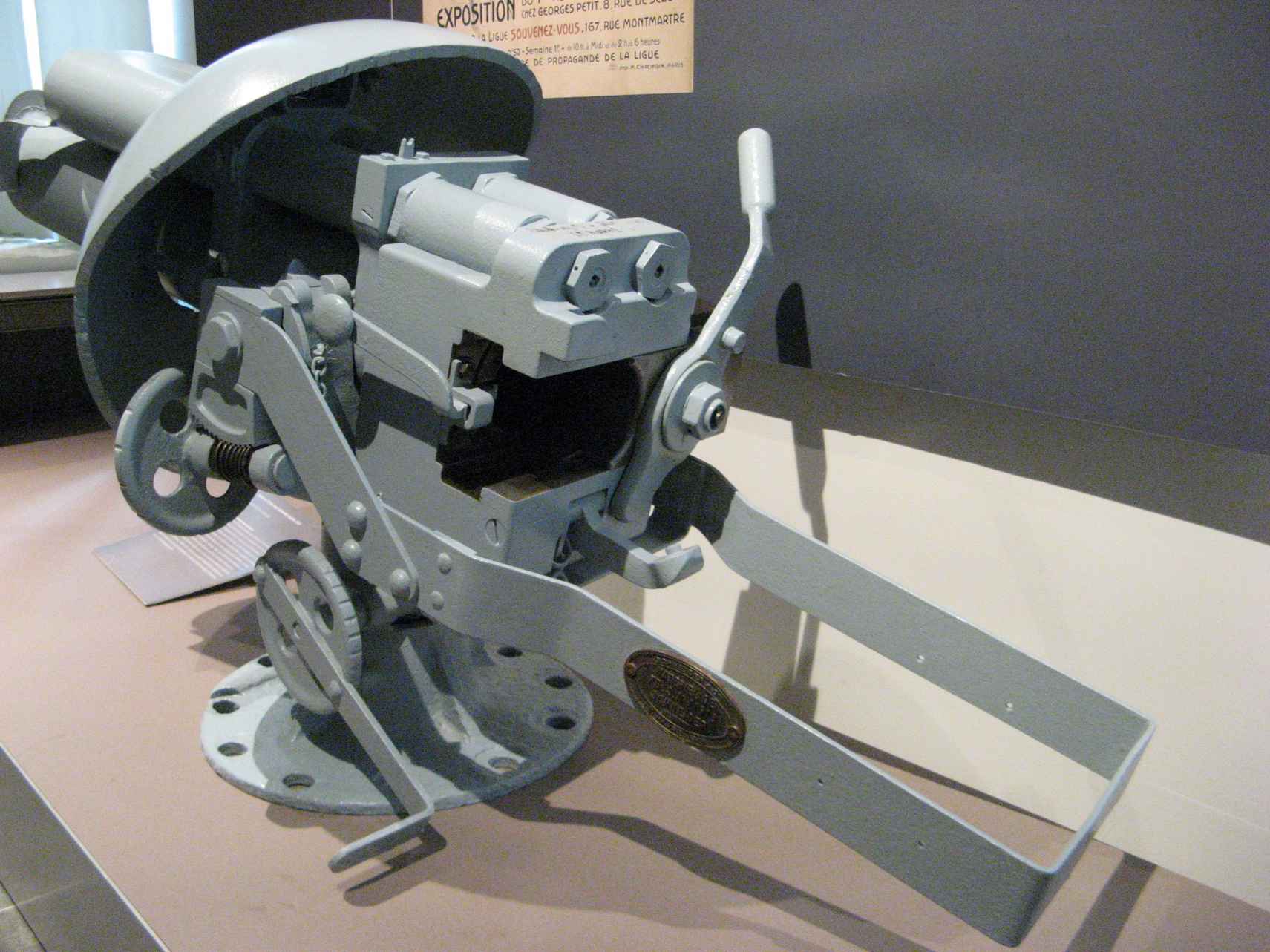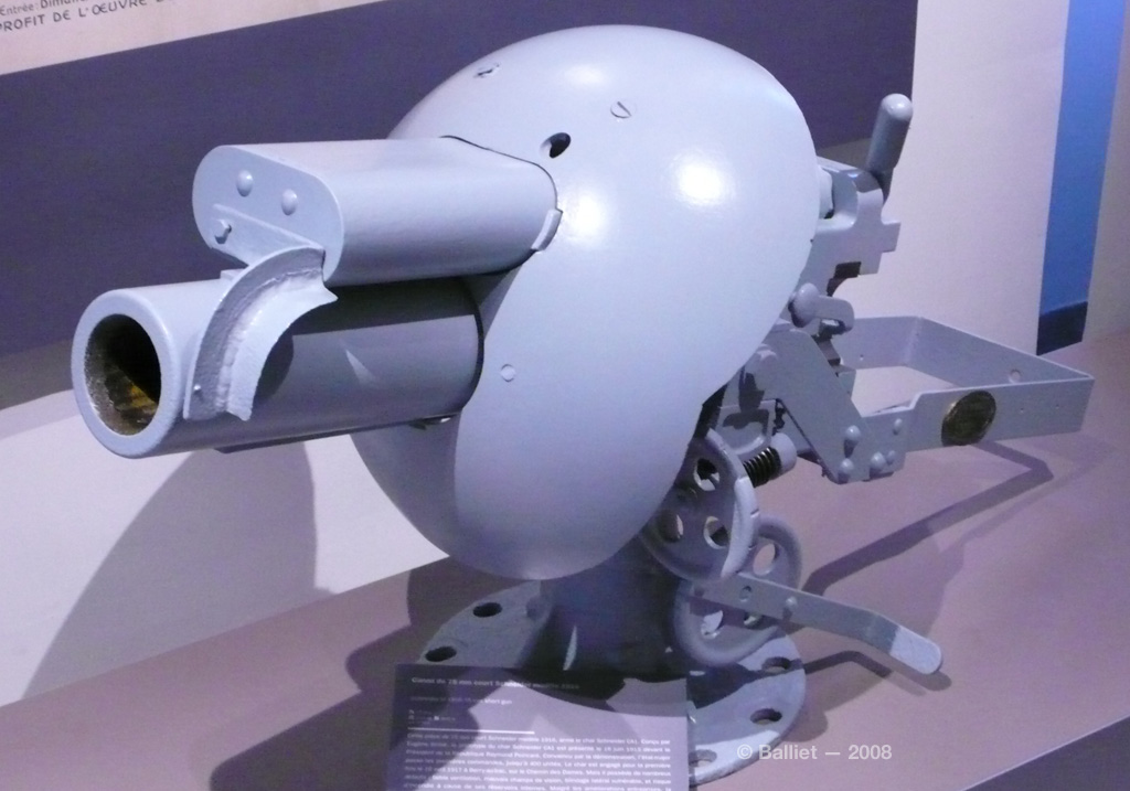 Dans le char Schneider, le canon était positionné dans la partie avant droite de la coque, dans une direction oblique par rapport au sens de la marche. Il tirait un obus explosif du canon de 75 mm de campagne Mle avec une douille raccourcie lui donnant une faible vitesse initiale (200 m/s) et une faible portée utile (600 m)