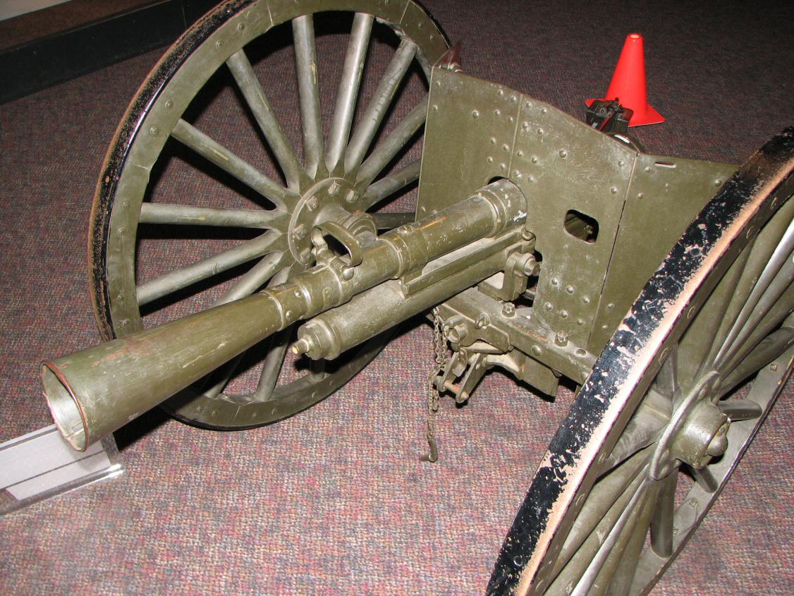 The light 37 mm (1.5 inches) caliber was introduced in the second half of the XIXth century as ship deck gun or landing gun in the Navy of several countries, including the one of France, as well as for close defence guns in fortresses/ The 37 mm Hotchkiss revolver-gun was the most famous representative of this latter category. Some of these light guns were indeed used on the frontline by several fighting nations during the improvisation times of the first months of WW1 and the start of the position war. The marine '37mm Mle 1885 TR' gun has been used as an improvised weapon on the French trenches as soon as the end of 1914, on 'chandelier' carriage or 'wheelbarrow' carriage, sometimes equipped with a Saint Chamond recoil recuperating system..