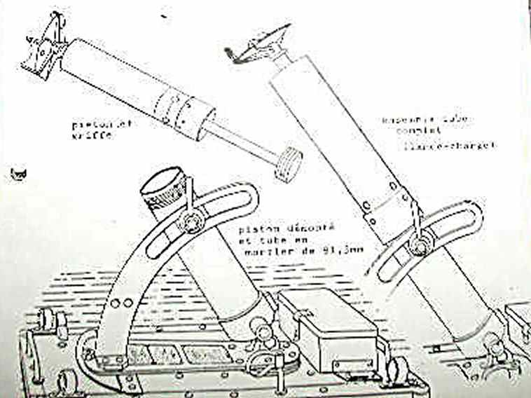 In its usual configuration, The 9cm Leichte LadungsWerfer Ehrardt was made of two 91.3 mm inner diameter steel tubes, butt threaded one to each other. The lower tube, orientable, was fixed to the platform via a pivot and was drilled with a threaded hole able to receive a classic minenwerfer primer. The upper tube, longer, was drilled with 4 gaz vents just over the junction thread. A long rod, equipped with a piston at its lower extremity and a kind of platform (projectile bearer) at is upper extremity, was inserted the two tubes assembly, the upper platform staying outside the upper tube. It could slide inside the tube, somehow like a piston in a bicycle pump.