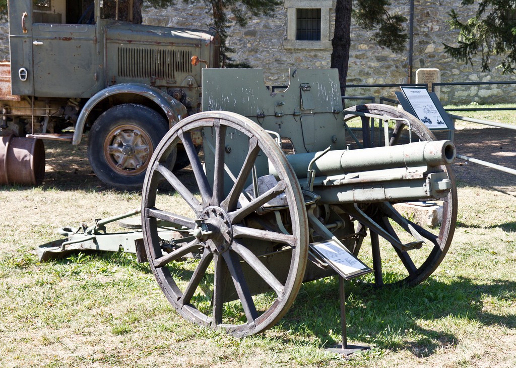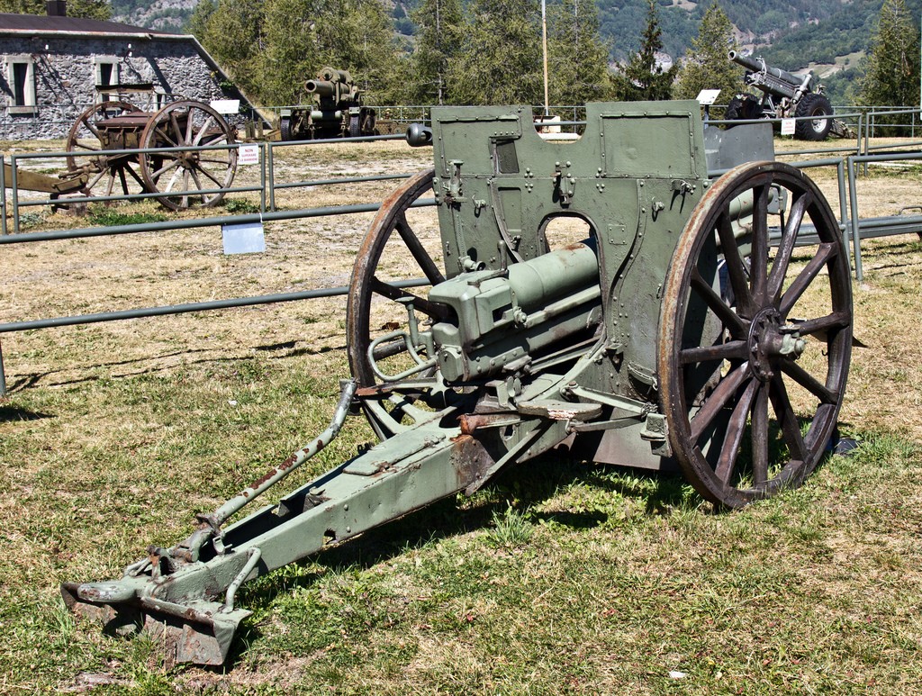 The 1905 model was modified in 1908 in order to improve its use in mountain operations, thanks to the possibility of rapidly dismounting / reassembling the gun into 3 separate loads for transportation and adapting it to a narrow width carriage (90 cm total width wheel to wheel). This new version was provided to all field artillery units, and was named '8 cm FeldKanone M 05/08',