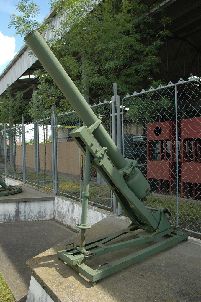 Austria received a first order for 100 of these '12 cm M16 MW' in Janaury 1916. This 1.5 m long smooth bore barrel mortar was loaded by the breech, to which was attached a big cylindric air chamber fed by a compreed air cylinder (with a 11 rounds capacity). A 50cm tube extension could be screwed on the barrel top in order to increase the range even more. The projectile was an unusually stocky cylindro-ogival shell equipped with a percussion fuze.