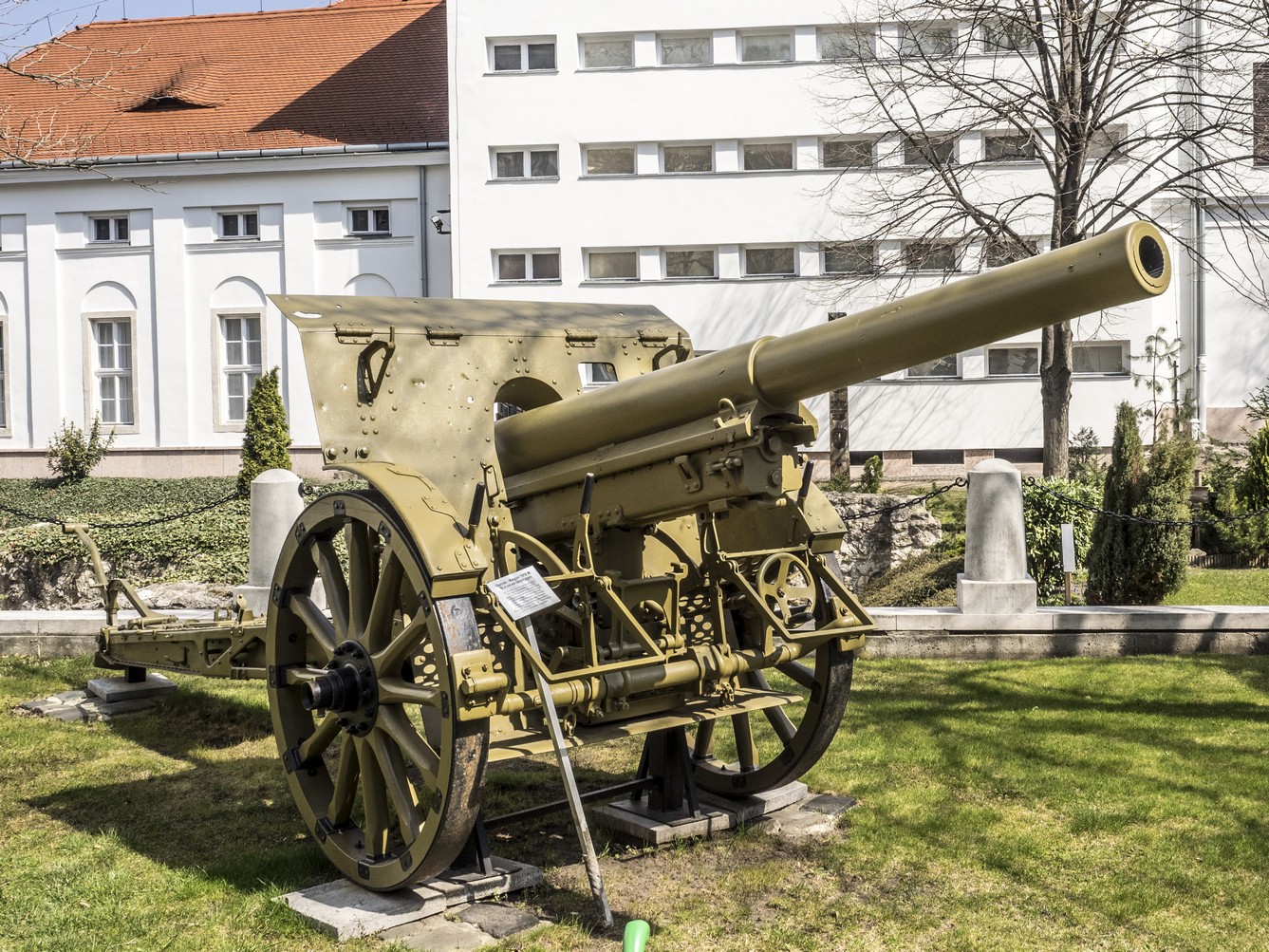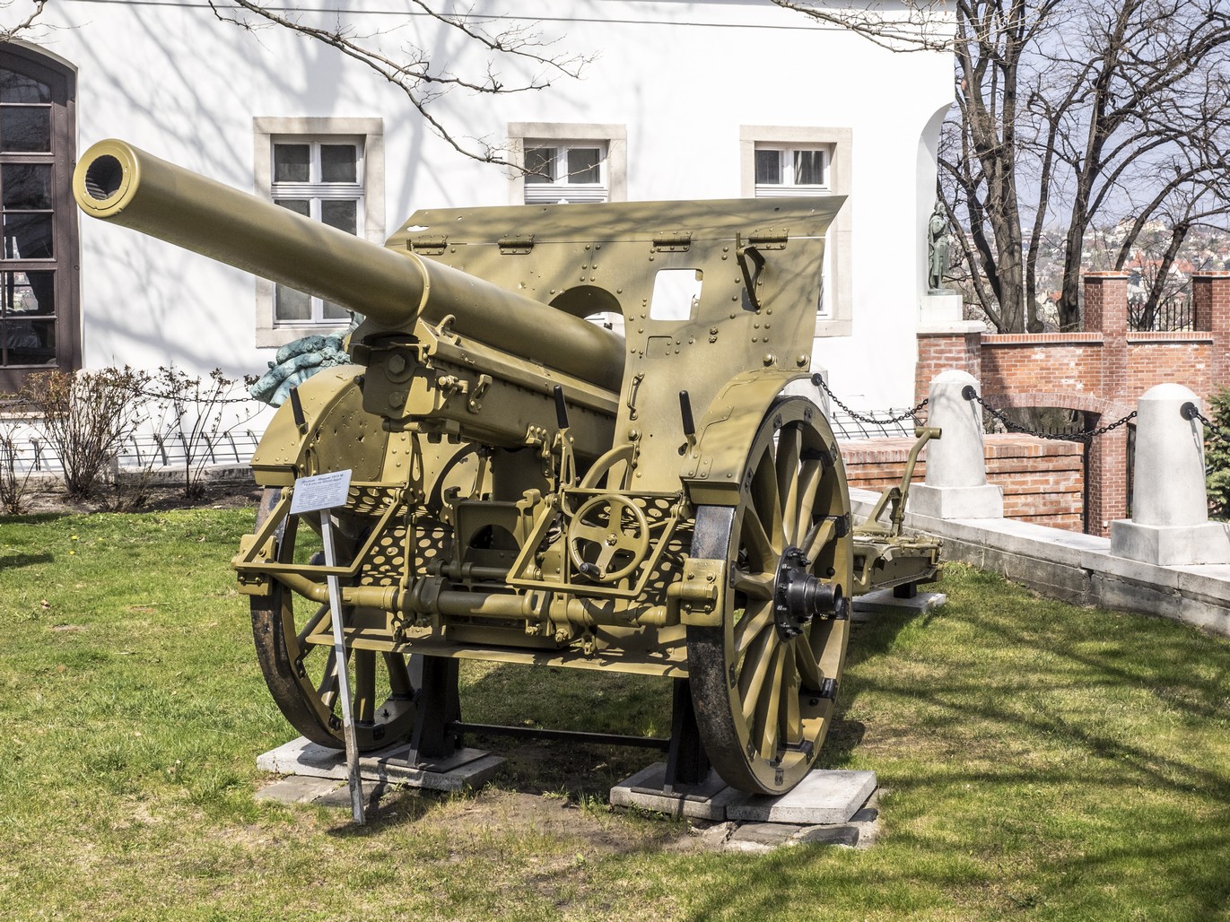 This good and modern weapon with a steel tube and a shield could be separated in two loads for tranportation. It had similar performances to the ones of the corresponding French and German guns, the 105 mm L Mle 1913 and the 10cm K 14. About 500 such guns were manufactured mainly by Skoda. After WW1, these guns were also produced in Italy by Ansaldo (and named Cannone da 104/32 Mod 15).