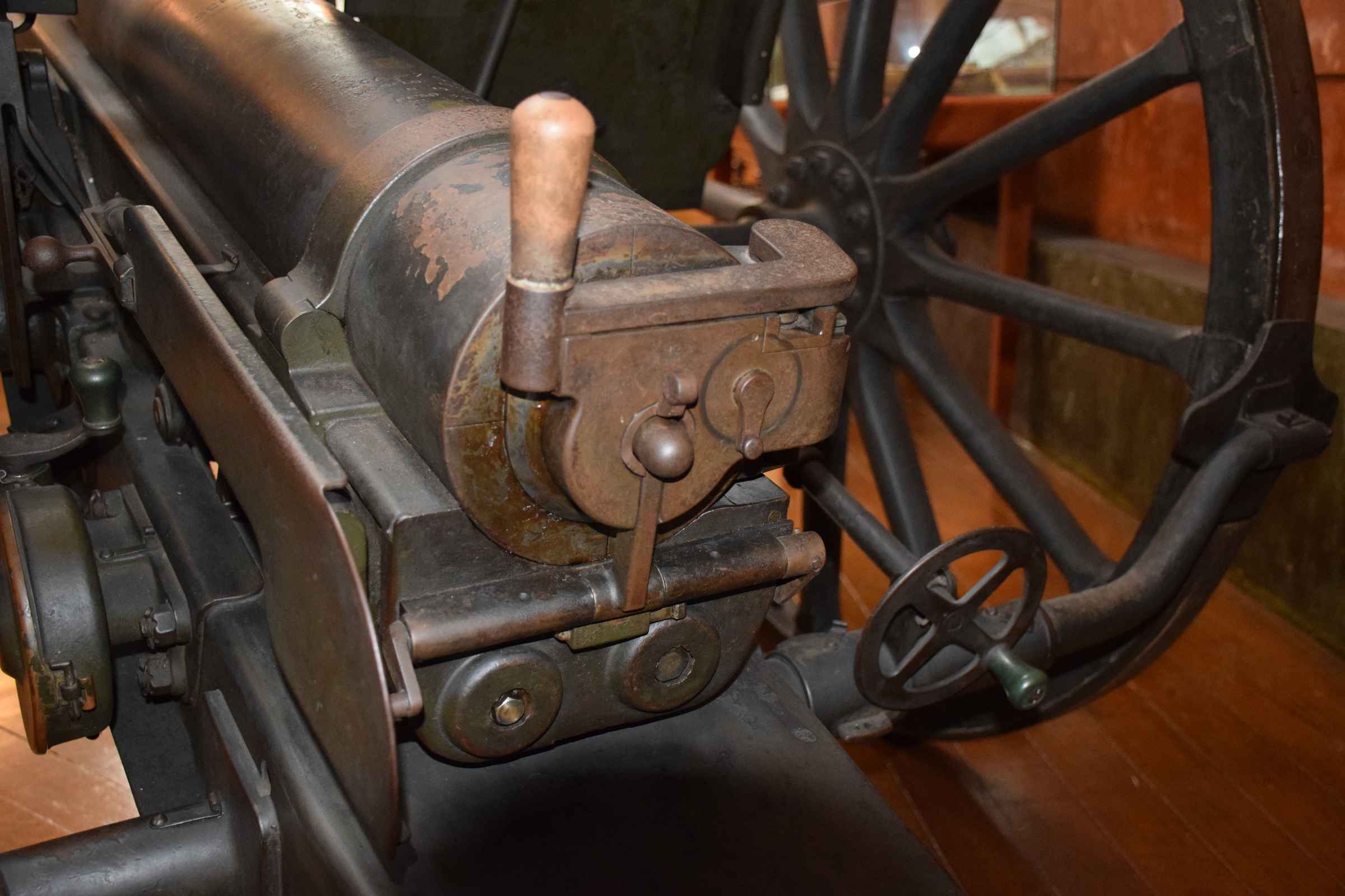 View on the Schneider-Canet breech. Barrel markings : 'Peça de 7.5 TR - Modelo 1904 - Nr 10 - Peso 339' et 'Schneider et Cie - Artillerie Schneider-Canet - Ateliers d'Artillerie du Creusot'