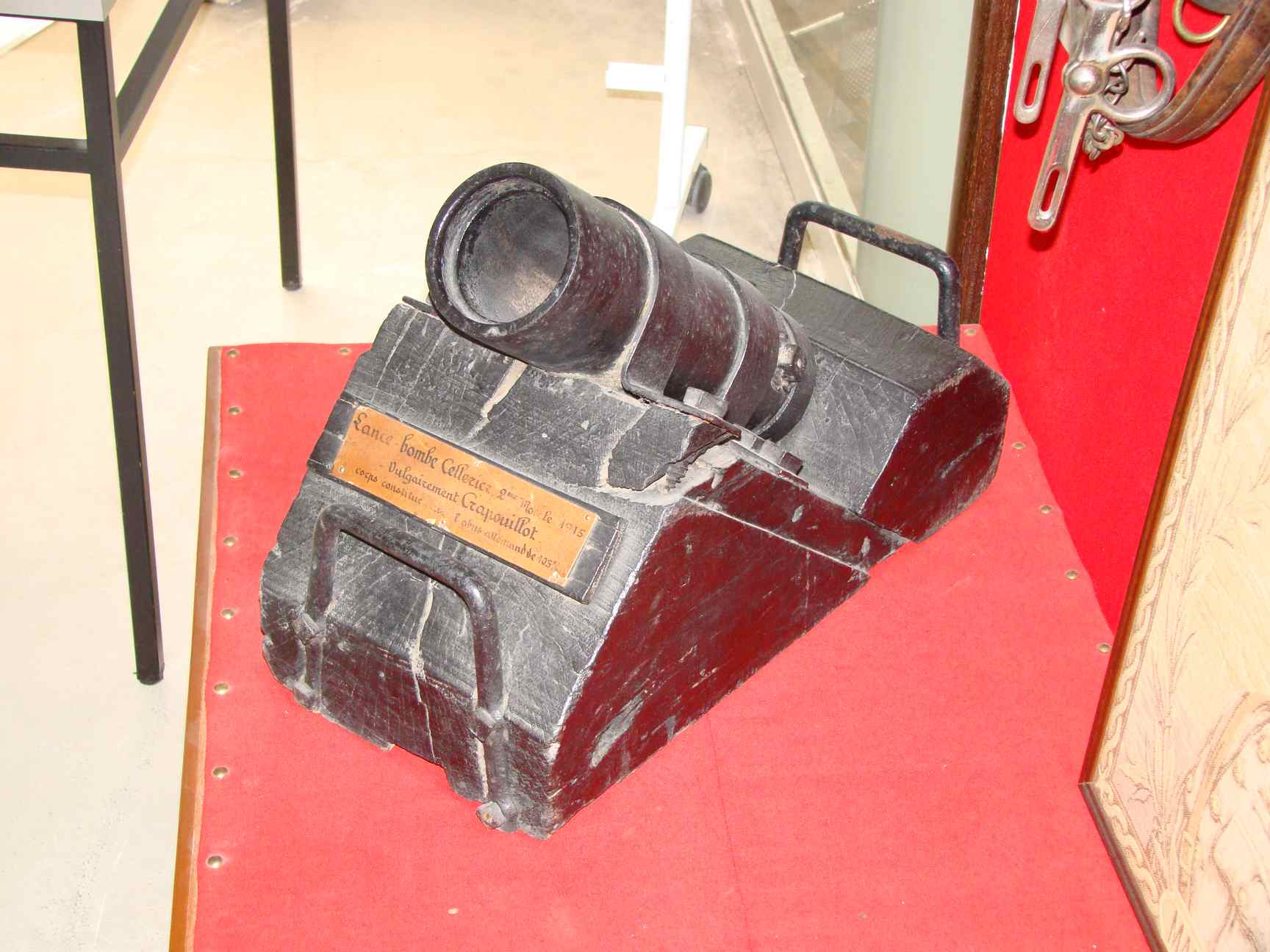 Nevertheless, the French soldiers were faced from the early 1914 war days to the powerful German minenwerfers, without any possibility to answer back. On the Argonne sector particularly crushed by these mortars, the Captain Cellerier improvised a 'DYI' mortar made with recycled material : he used a German 77 mm shrapnell shell body mounted on a wooden wedgehaving a 45 degrees angle to launch projectiles made of French 65 mm mountain gun shells, whose diameter is by chance similar to the inner diameter of the German shrapnell light shell, filled with explosive and various shots types.