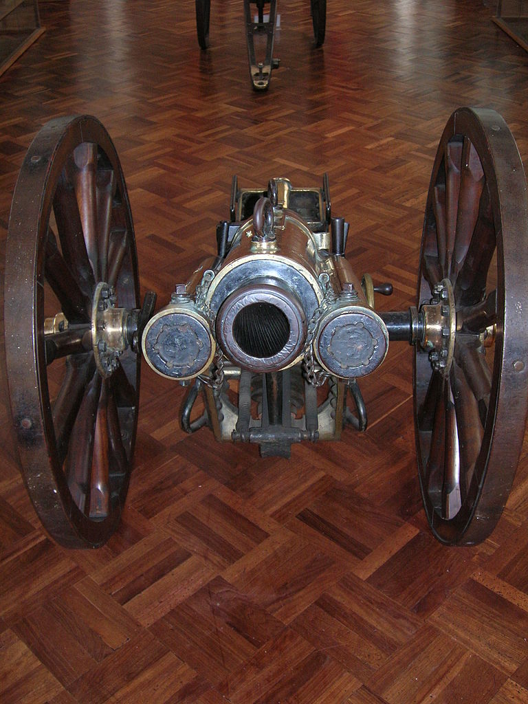 Designed by Vickers, Sons and Maxim in 1897 at the 75 mm metric calibre for Egypt, this little artillery weapon was the first British gun to be equipped with a recoil buffer. This first experience however was not a pure success, since the recoil had to be controlled additionally by ropes blocking the wheels movement. Its metric calibre sometimes made it called 'millimetre gun'.