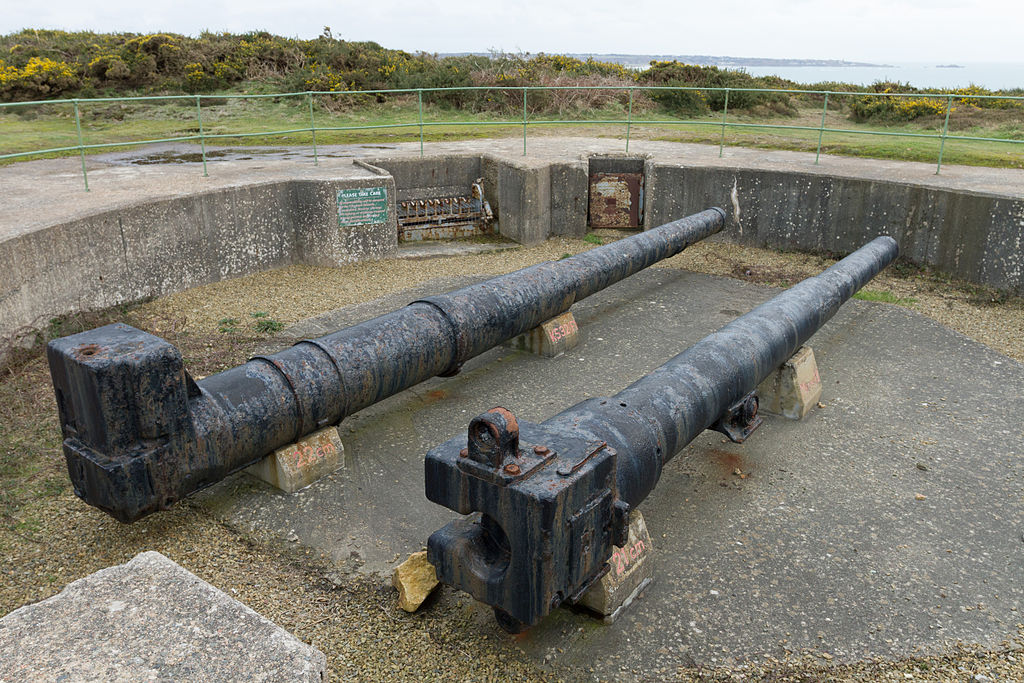This French 220mm Mle 1917 barrel (at left), used by Germans on this portion of the Atlantic Wall, is at the side of a German 21cm Mörser M18