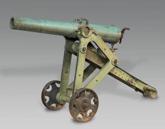 In the middle of the 19th century, Treuille de Beaulieu invented the first French rifled guns, in bronze and loaded by the muzzle. This technique significantly increased the range of the weapons, and even more their firing power since it allowed to replace the usual spherical bombs by cylindrical shells with ogival head, of much bigger weight for the same caliber. The projectiles had copper studs around their cylindrical section in order to guide them in the barrel grooves both during the loading and the firing processes.