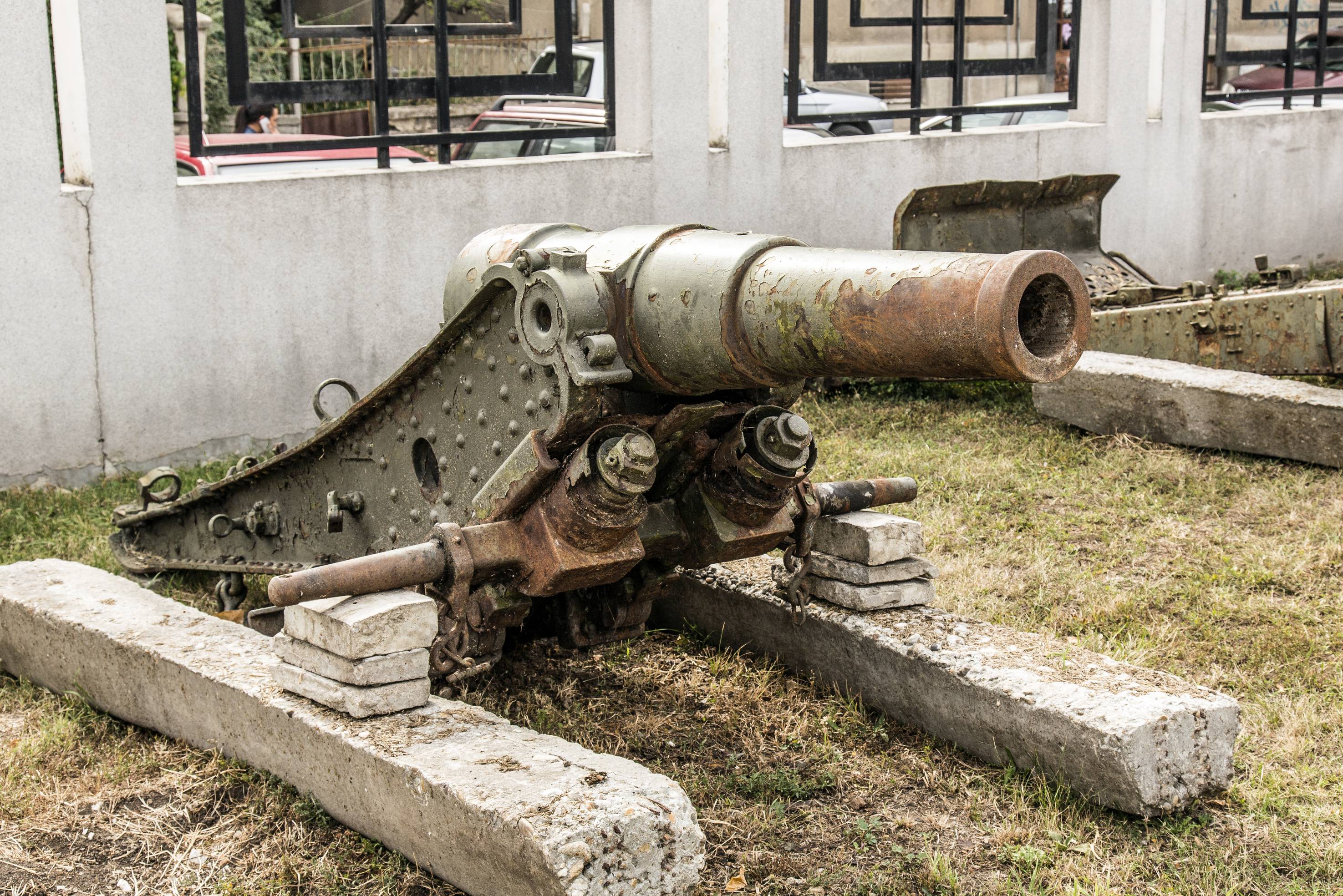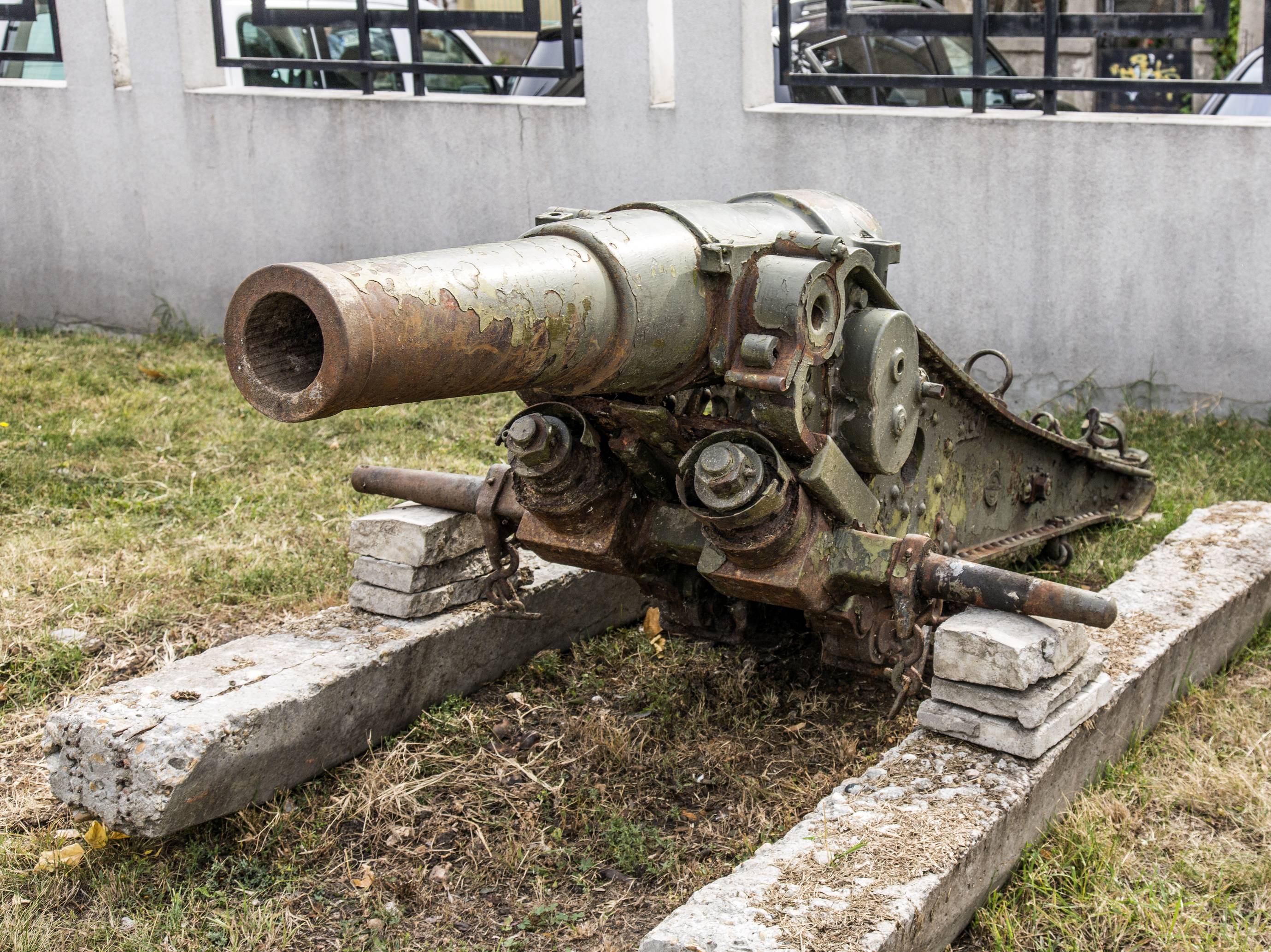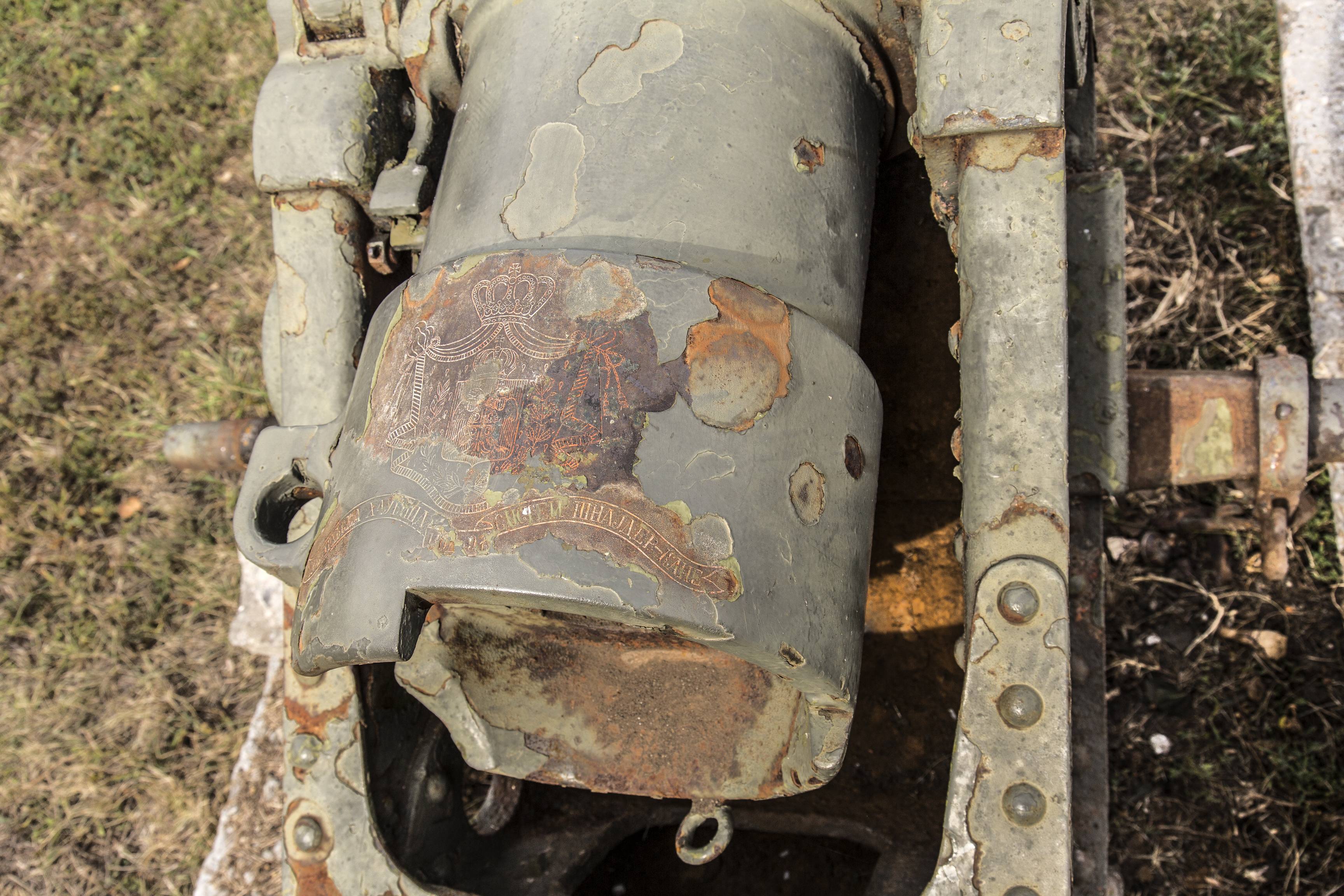 The howitzer is in a bad condition. The springs of the recoil recuperation system are visible