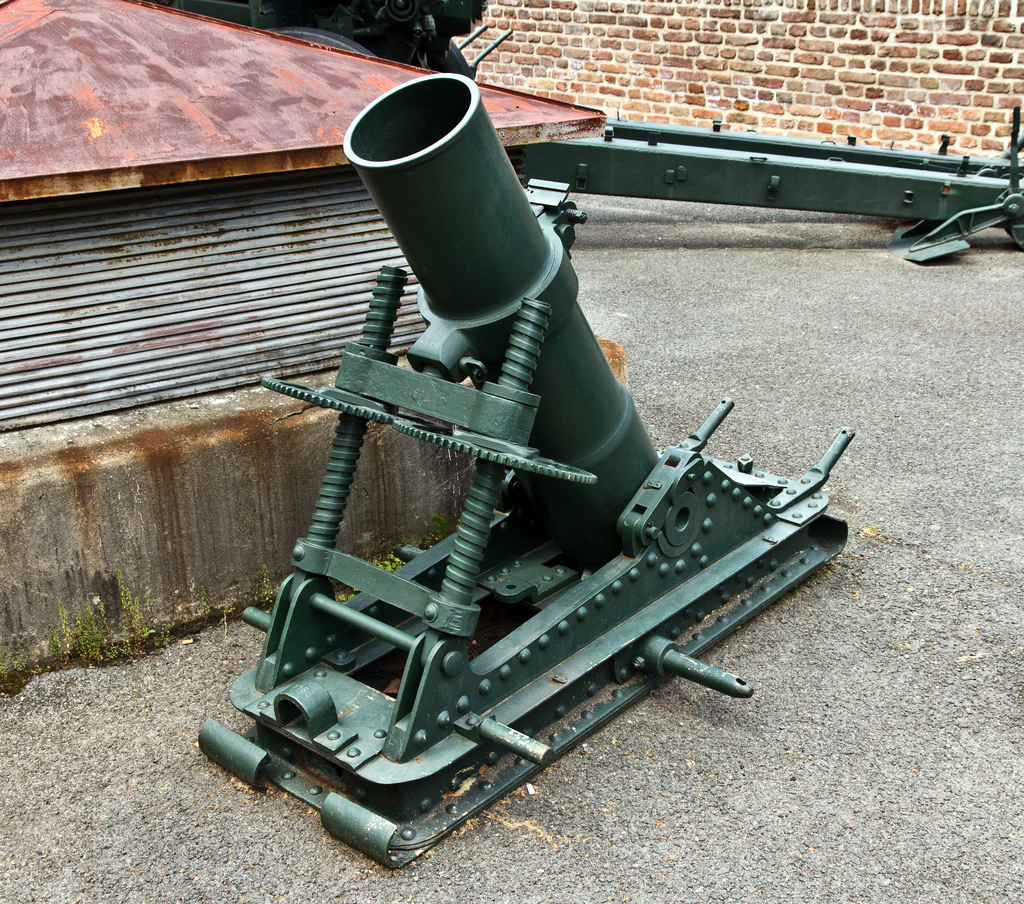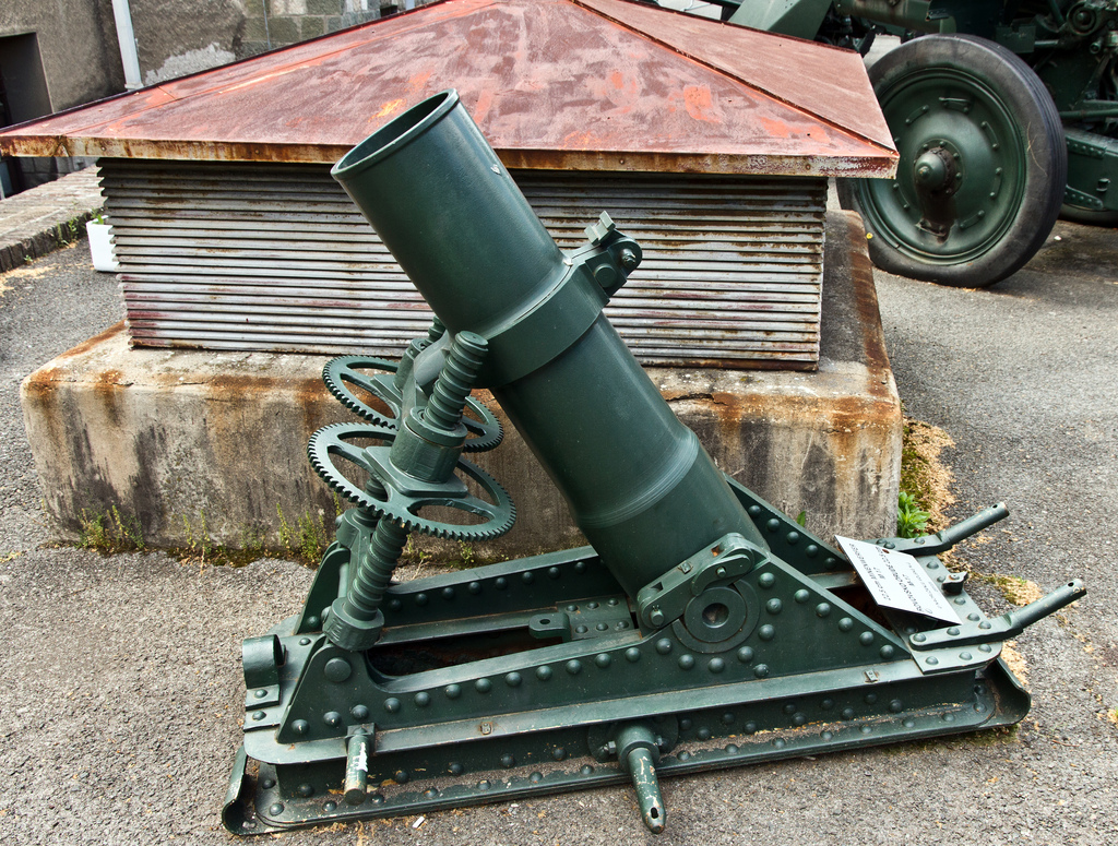The '22.5 cm MW M15', whose profile was easily recognizable with its two huge frontal screws dedicated to the vertical aiming, was delivered to the armies from June 1915. Appreciated for its simple design as well as for the power of its shells, this smoothbore mortar, muzzle loaded and without any recoil recuperation system was although lacking of precision, and subject to duds (when its bomb landed on its side on soft grounds). It could launch both high explosive shells and gaz shells. For transportation, it was equipped with M99 mountain gun wheels.