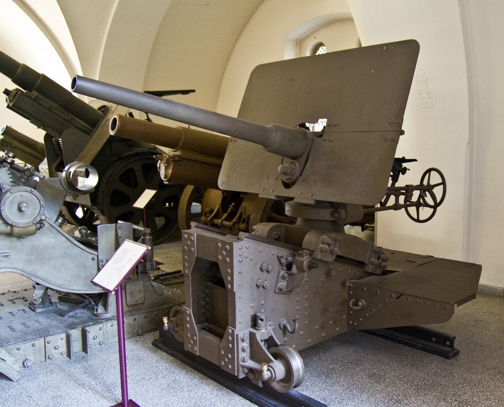 Manufactured by Skoda; this very long barrel gun was equipped with a large shield. It was mounted on a deformation carriage placed on a central pivot, resting on a small wagon sliding on a wedge. This assembly was fixed on a rotating platform. The inclined wedge allowed to hide or show the gun.