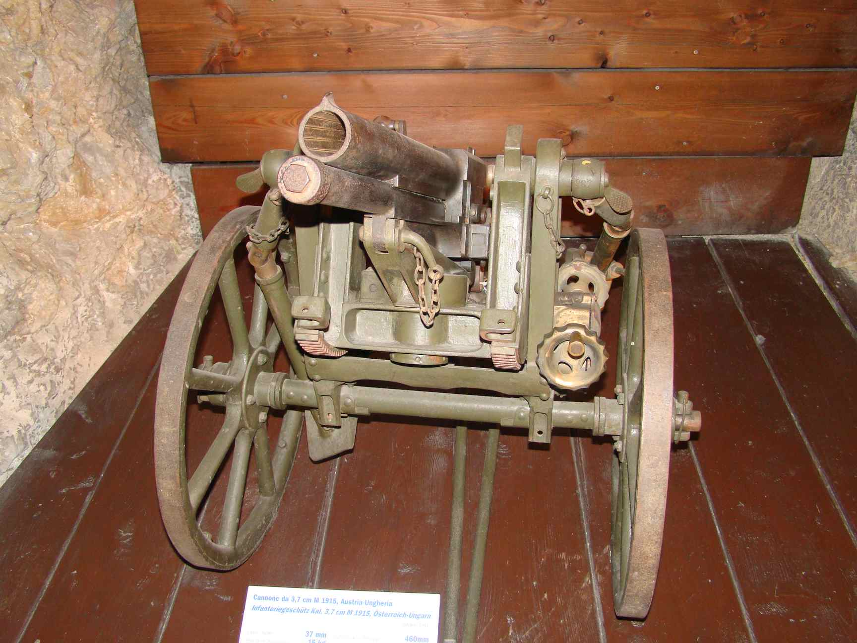 This small gun prototype of the future '37 mm M15 InfantrieGeschütz' was rapidly tested in the Western Front in October and November 1915, and adopted. The 60 first detachments with 2 guns each arrived on the front as soon as February 1916. The guns based on a simple carriage, a very short (10 calibres) 37 mm barrel, a Skoda falling block breech mechanism and a hydro-spring recoil brake from the same company were weighing less than 100 kg in position and could be transported either on a small wheel axis or on mules, or disassembled into 3 separate parts of about 25 kg each that could be handled by men.