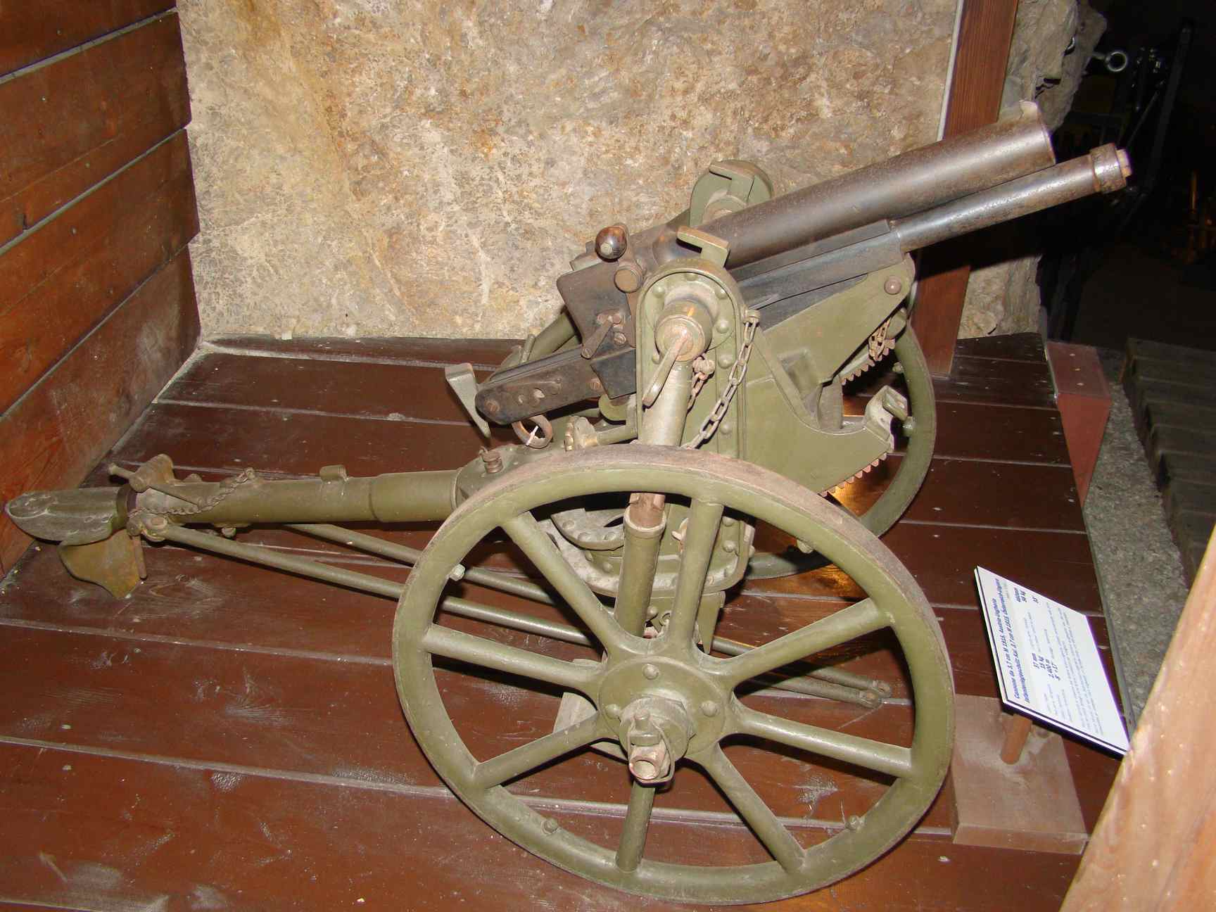 With the war first fights, the different armies infantry units soon felt the need to have weapons able to neutralize, with precision and without danger for the first line friendly units, machine guns nets protected by sandbags of light fortifications resisting to indirect shelling, by direct shooting through their embrasure. This mission was made even harder because of the difficulty to bring material and ammunition in the first lines, with narrow trenches, devastated grounds or mountain positions. Austro-Hungaria, whose armies were equipped and trained for mountain warfare, soon discovered that the light mountain artillery dismantable guns were not convenient for that specific mission, and that a ultra-light flat fire weapon was needed.