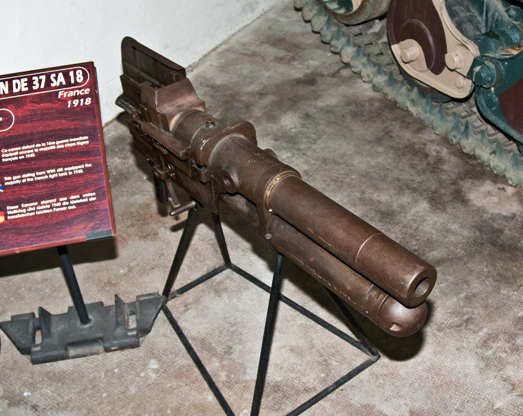 This weapon was an evolution of the 'Canon de 37 mm Mle 1917' that was equipping both aircrafts and automobiles and was itself an evolution of the famous '37 mm Mle 1916 TRP infantry gun' designed by the same Puteaux arsenal. The adaptation of a semi-automatic vertical sliding block breech mechanism alloed the automatic ejection of the cartridge, giving to the gun a nice practical fire rate of 10 rounds per minute. Although its low range and small projectiles made it about harmless against steel shieldings and heavy entrenchments, it was powerful enough against machine guns nests and infantry positions. After WW1, it was also installed on Renault R-35 and Hotchkiss H-35 tanks, Peugeot armoured cars and several types of Polish armoured vehicles.