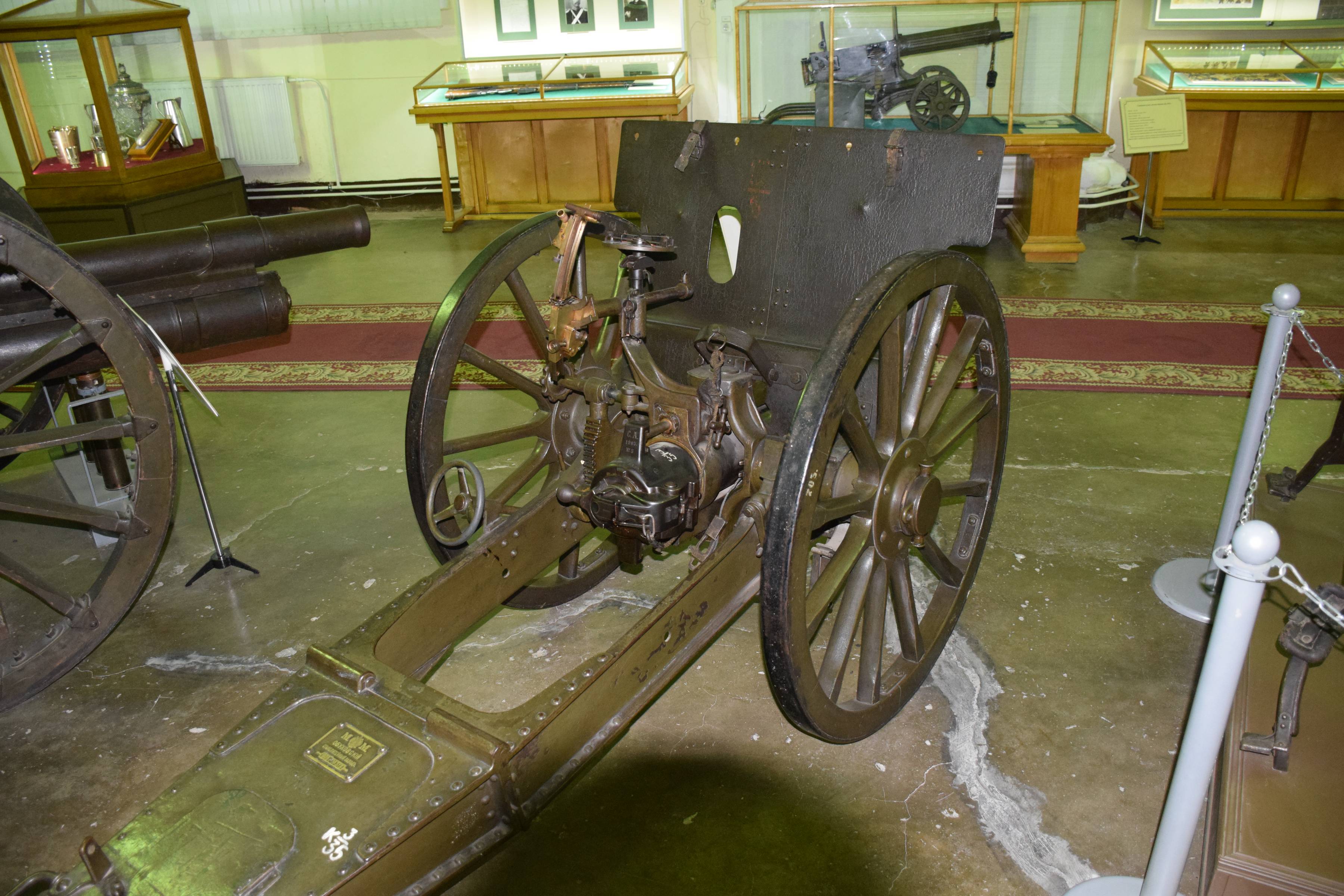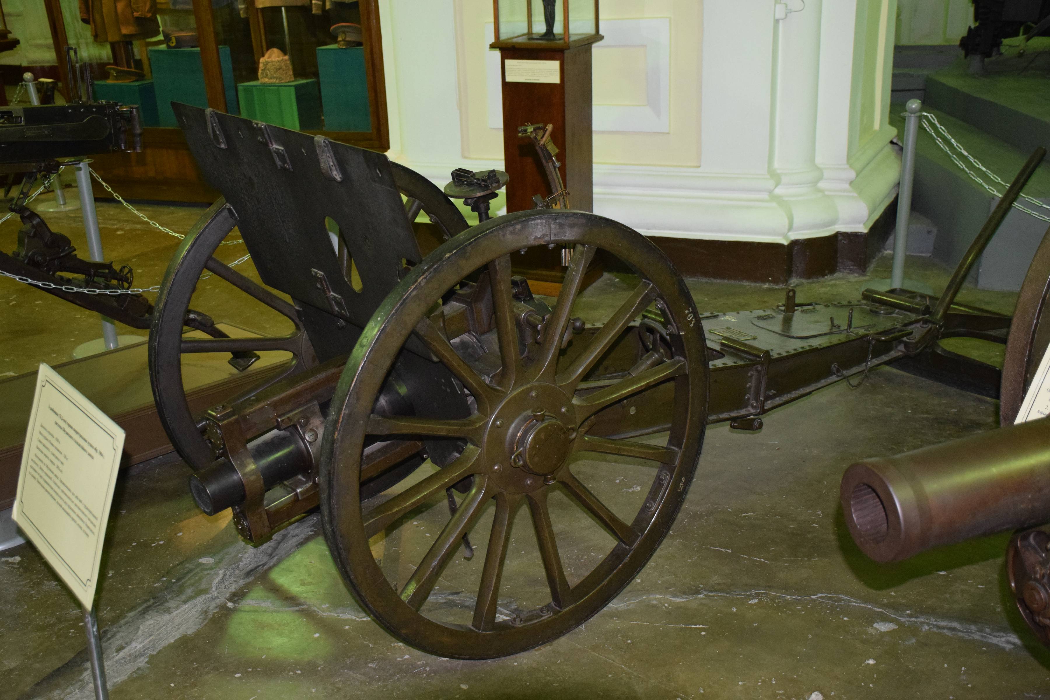 But this gun was found disappointing when used : the low position of the barrel was limiting the elevation angle (and consequently the range), and the two recoil recuperation system cylinders were found very difficult to synchronize, not to mention the dust and mud that were accumulating on the lower cylinder during towing. Therefore it was quickly and thankfully replaced in 1909 by the much more talented 3-inches M1909 Putilov designed by Schneider-Danglis.