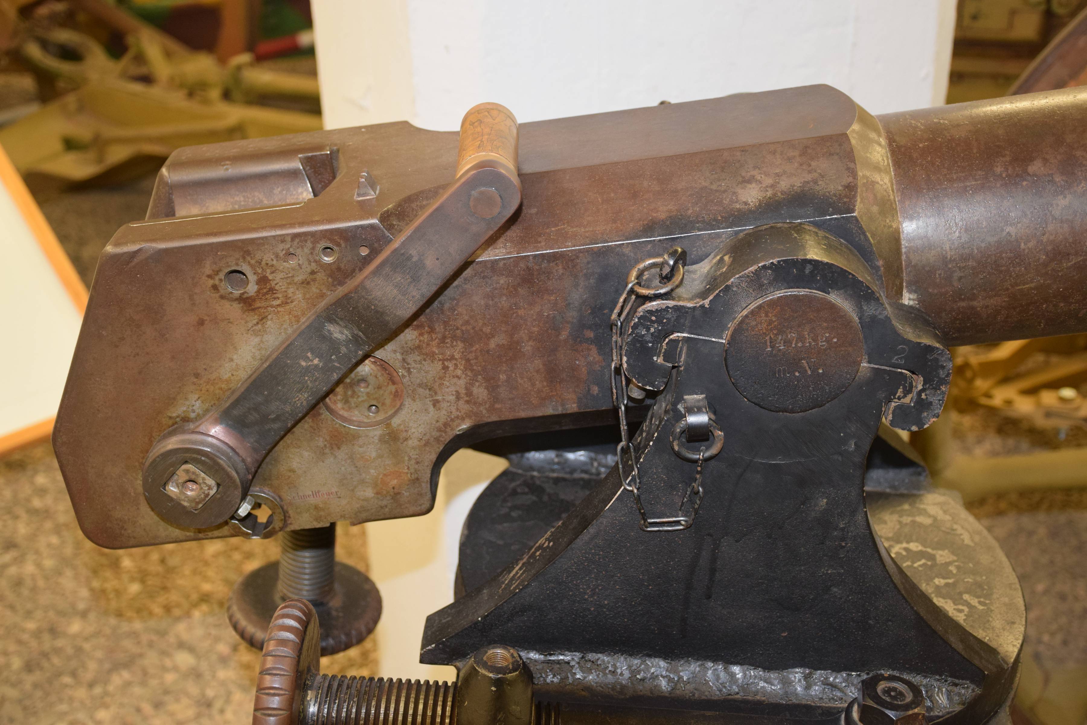 This gun earned the 'quick fire' qualification since it could reach the impressive rate of 25 rounds per minute thanks to pre-assembled ammunitions and the vertical sliding block Gruson breech. This rate was indeed slower than the one of the revolver guns (50 rounds per minute), but was still considerable and deadly in conjunction with the power increase given by the bigger calibre.