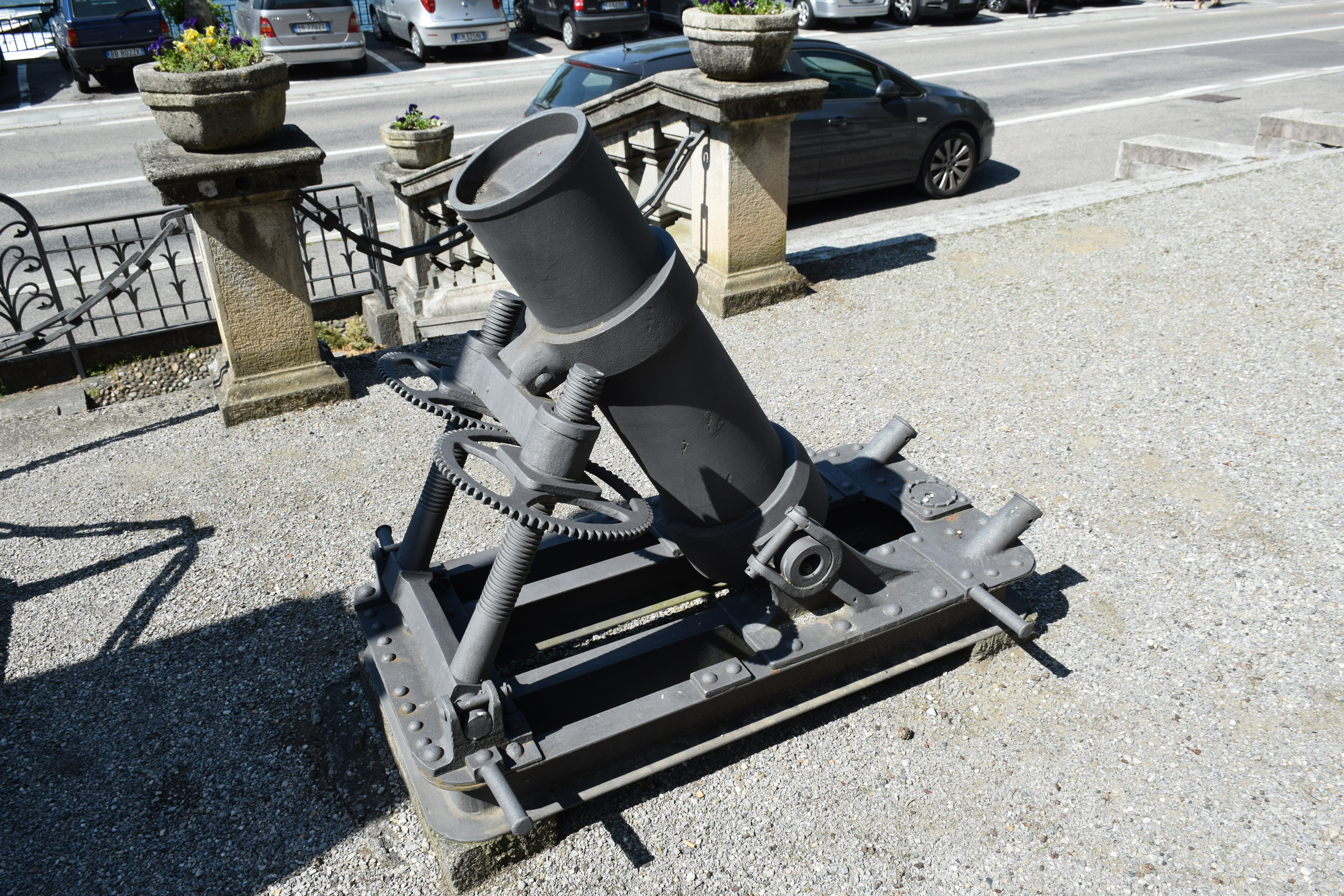 The '22.5 cm MW M15', whose profile was easily recognizable with its two huge frontal screws dedicated to the vertical aiming, was delivered to the armies from June 1915. Appreciated for its simple design as well as for the power of its shells, this smoothbore mortar, muzzle loaded and without any recoil recuperation system was although lacking of precision, and subject to duds (when its bomb landed on its side on soft grounds). It could launch both high explosive shells and gaz shells. For transportation, it was equipped with M99 mountain gun wheels.