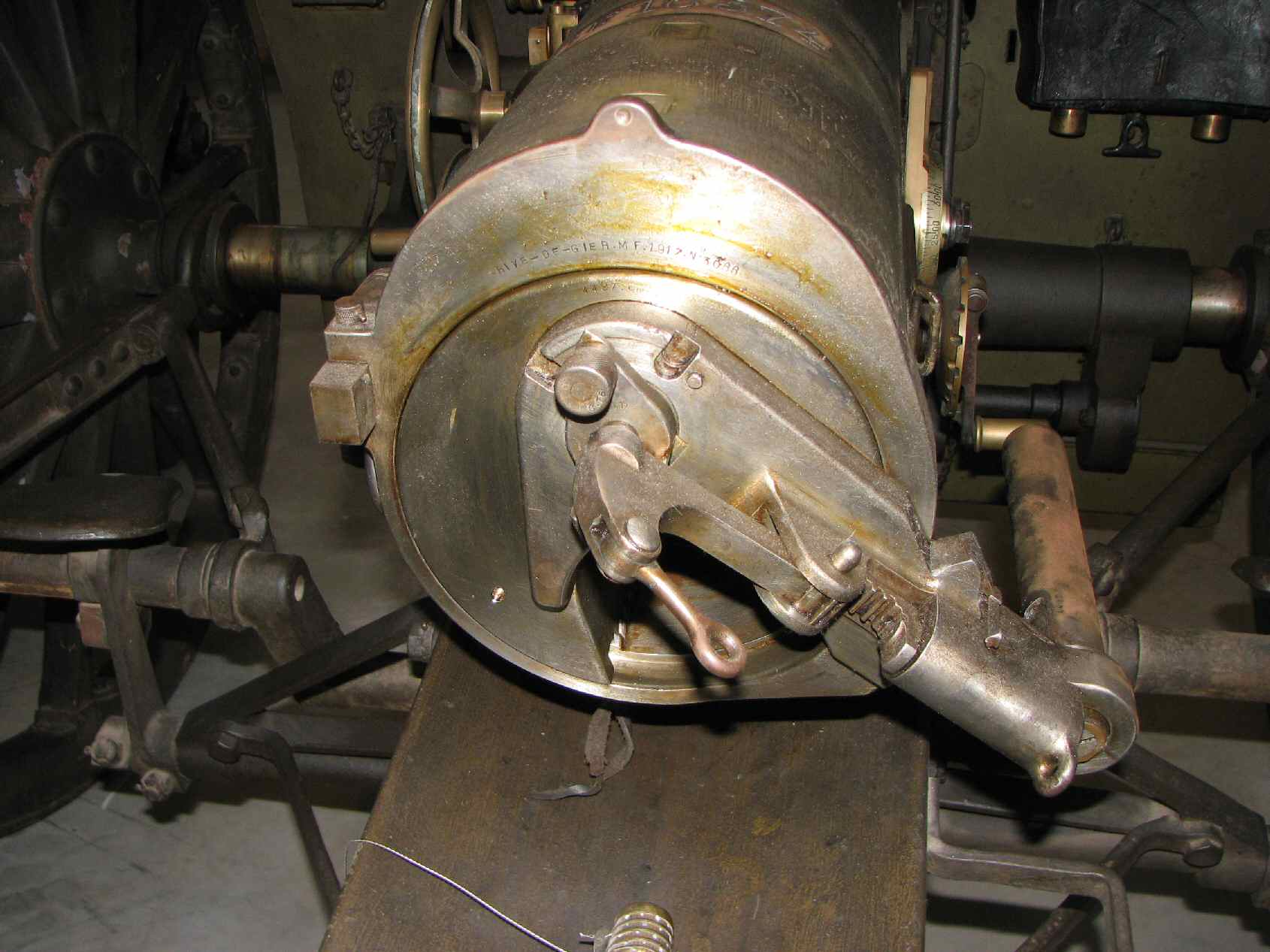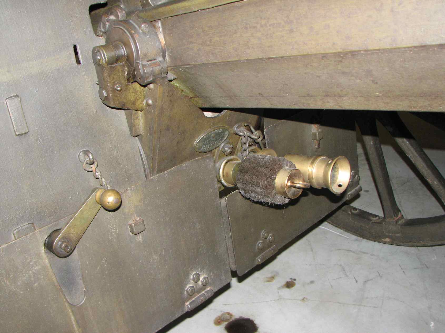 View on the breech. Marquage 'Rive de Gier MF. 1917 n°3088 - 16374 - A.B.S. 1917'. The carriage has hence been produced by Saint Chamond |