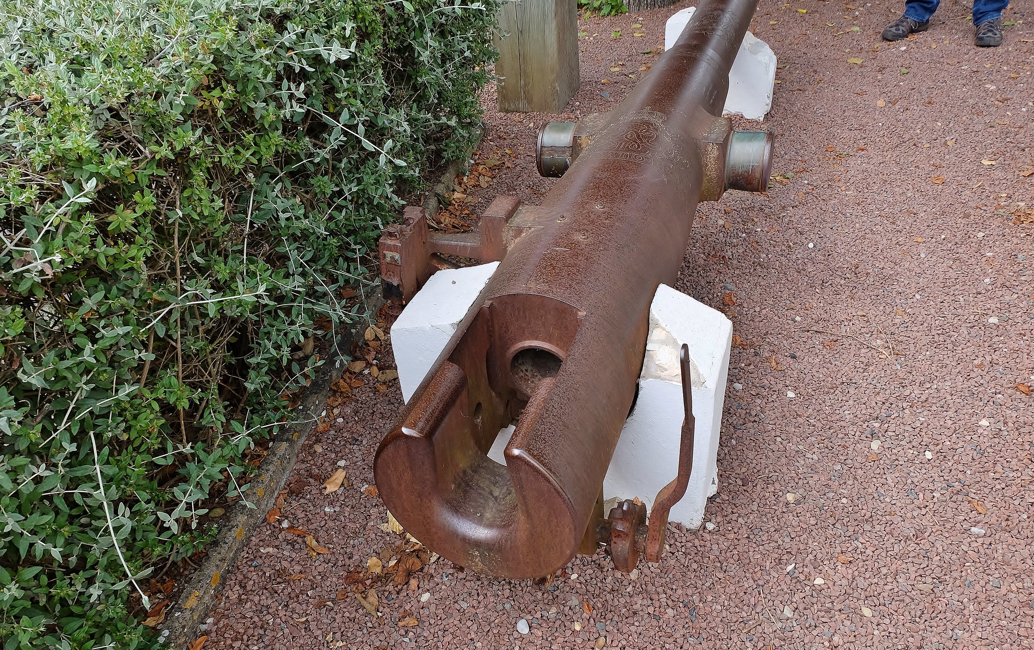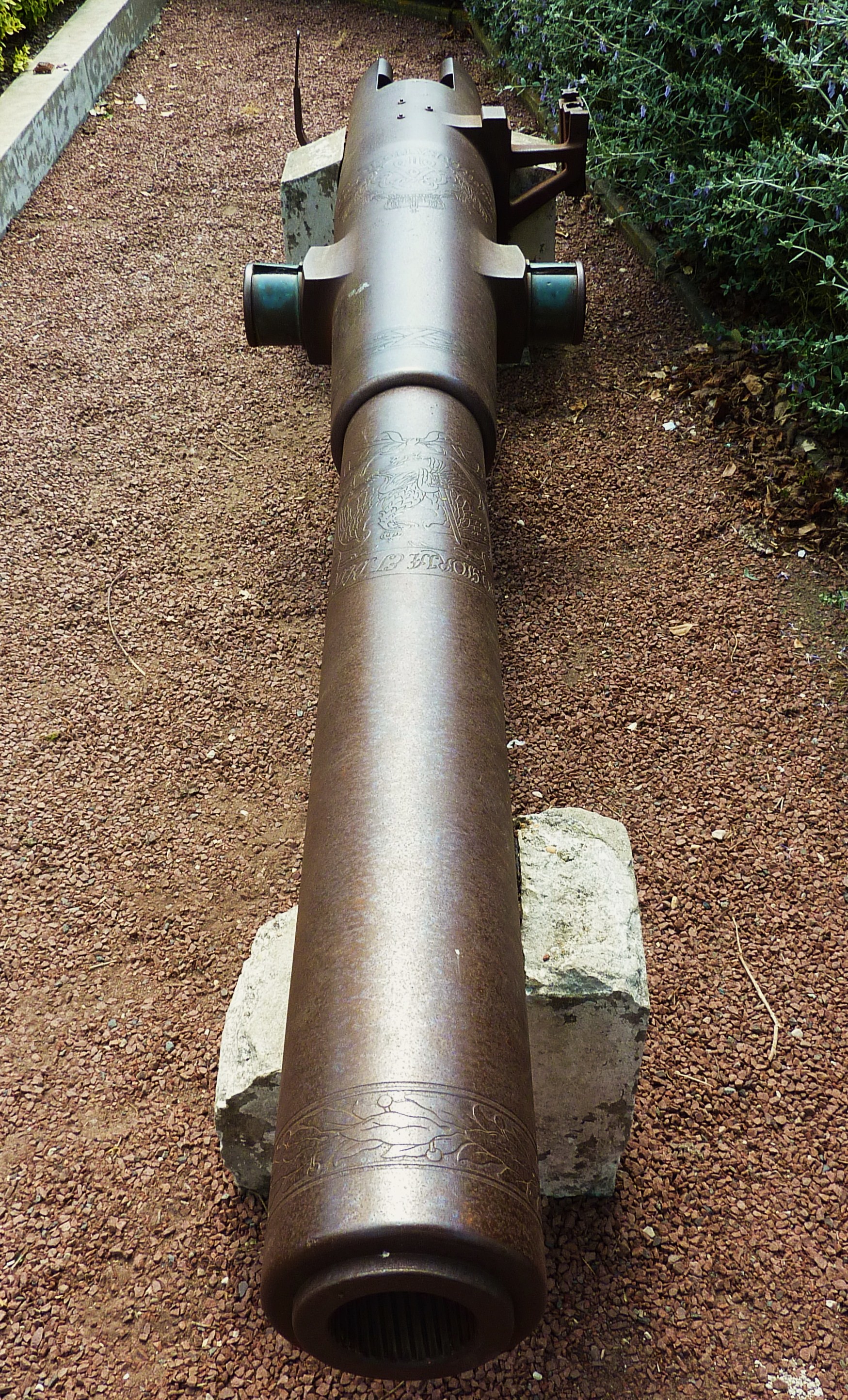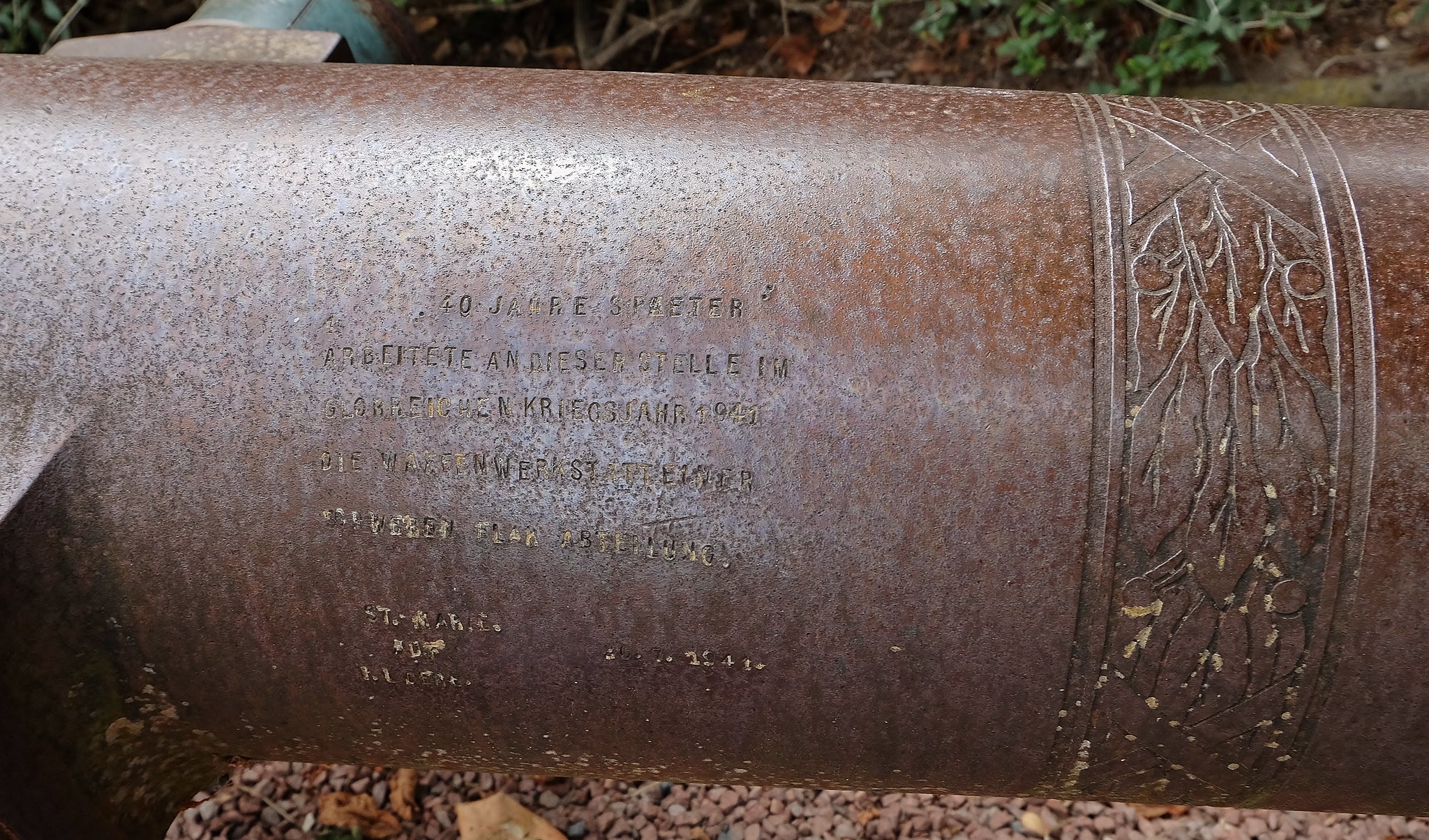 Panel placed next to the gun: Intended for corps artillery groups, 40 kg shell, 6 km range. The marks on the barrel are those that were regulatory in the Kingdom of Prussia until 1919: Prussian eagle and motto "Pro Gloria et patria", royal monogram laurelled and stamped with the sentence "Ultima ratios regis". The chasing of the muzzle and the edge of the jacket are also regulatory. This cannon, then with its wheels, a trophy from the war, had been placed at the foot of the Monument aux Morts with two machine guns dating from the 1914-1918 war, also on wheels. In July 1941, German soldiers from the German AA stationed at the Salée battery (in the commune of Sainte Marie de Ré) were tasked with recovering these guns (hence the inscription engraved on the side). The gun was towed behind a lorry, but the worn wheels did not resist and the barrel landed in a ditch where it remained until the end of the war. Recovered in 1945, it returned to its present location.