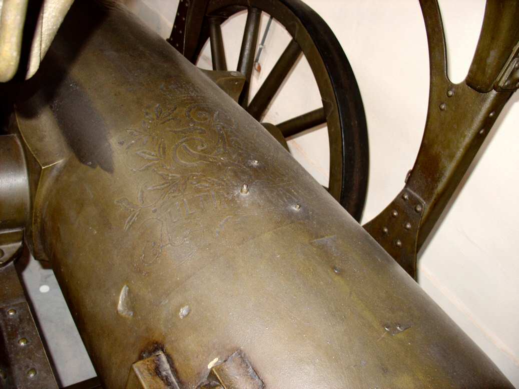 This mortar is mounted on its transportaion wheels. Unreadable markings