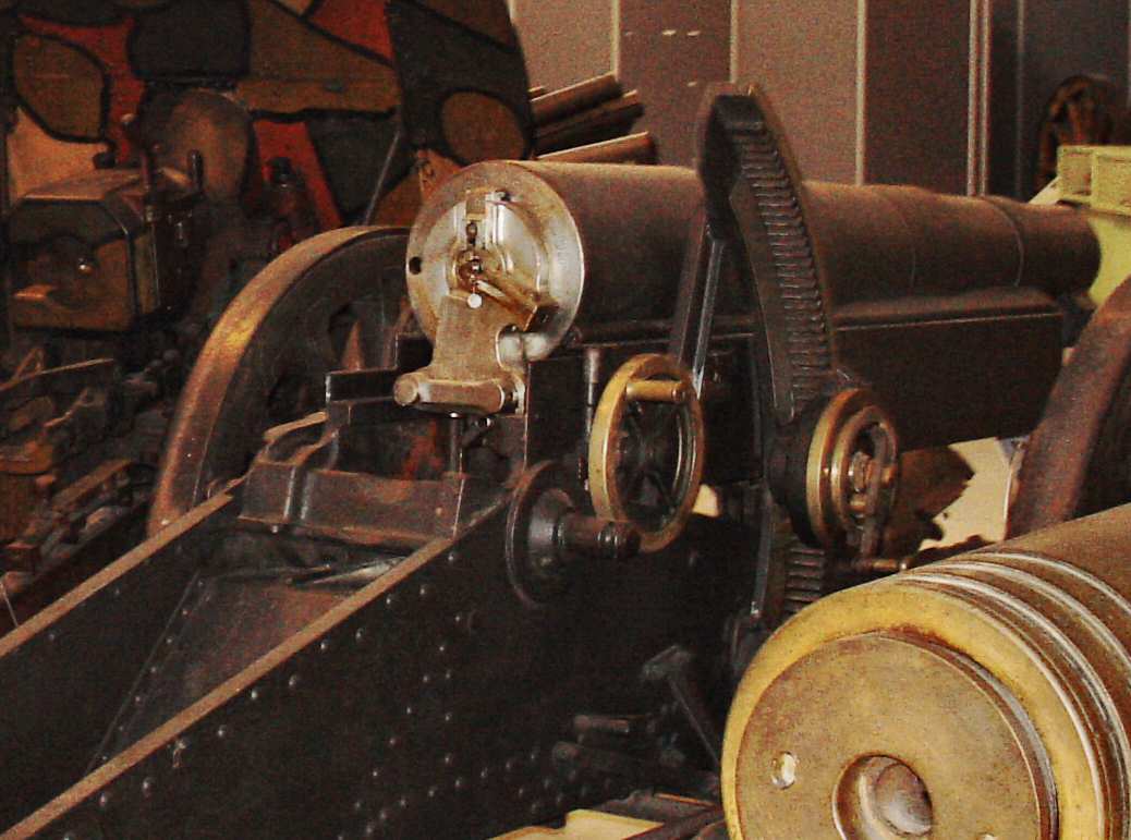 The breech of the (modified) de Bange barrel was also typical : the original de Bange one was replaced by a automatic opening / semi automating closing interrupted screw breech, unusually translated backwards along two parallel rods in open position in order to serve as a shell handling device as well.