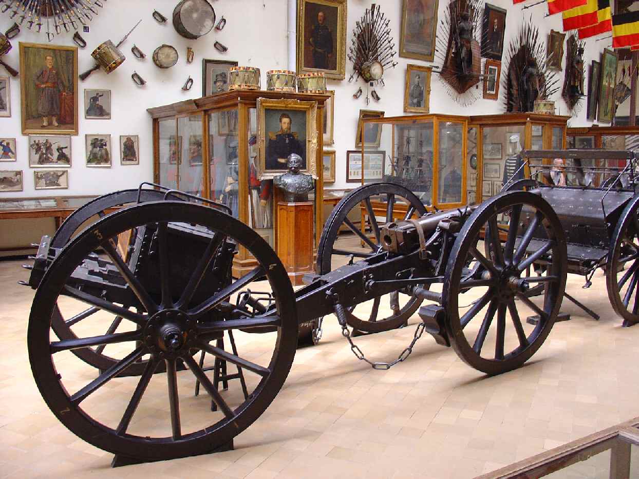 Le canon du Musee de Bruxelles est expose avec son caisson marque 'Vide 1160 kg - Ch. 1625 kg - Modele 1882'.