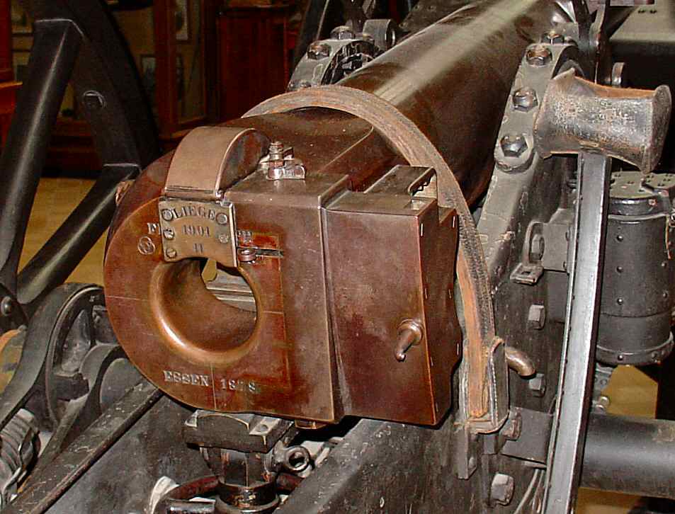 The breech upper marking 'Friedr. Krupp' has been recovered with a plate 'Liege - 1901 - II', as a consequence of the initial gun modernization in a quick fire gun.