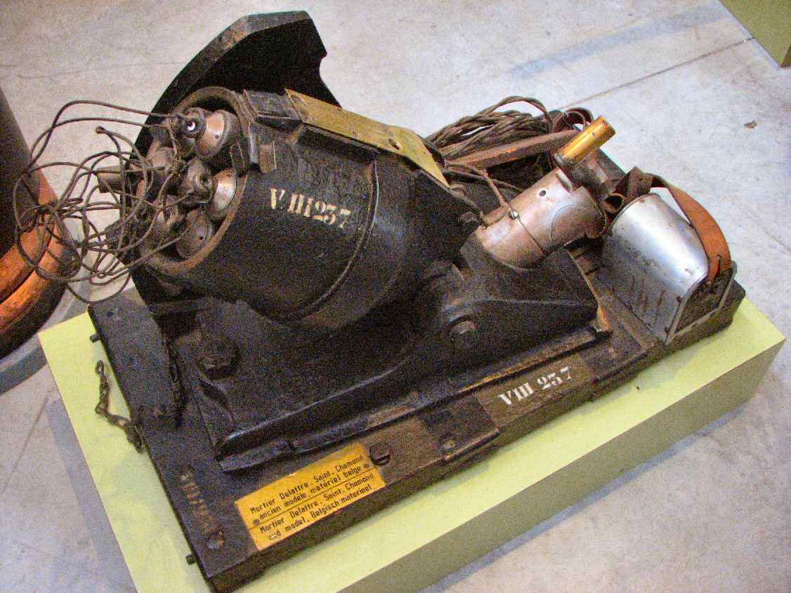 Delattre had participated at the end of the XIXth century to the design of the Belgian high explosive 'Macarite', but he also had designed a grenade launcher that was being tested by the Belgian Army at the beginning of 1914. This interesting weapon with a shape close to the one of the old 'Louis-Philippe' French mortars had been designed to launch clusters of 1 kg fragmentation grenades linked to each other by long steel wires. The grenades time wicks were set so that the explosions would happen with a 1 second interval, each of them moving the cluster to a unpredictable direction and range, creating a 300 square meters dangerous surface and probably some panic ! It could also launch a single 2.5 kg grenade.