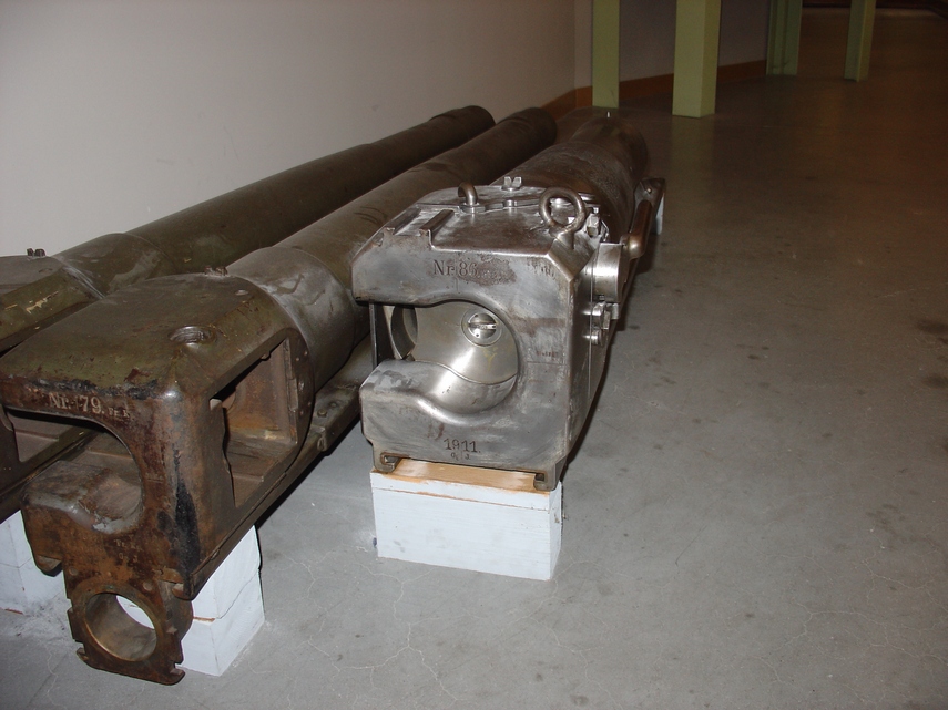 Amogst the improvements were a considerable lightening of the tube, a hydro-mechanic recoil brake / recuperator, a breech improvement, a box trail with central void allowing the tube high elevations, and a shield.
