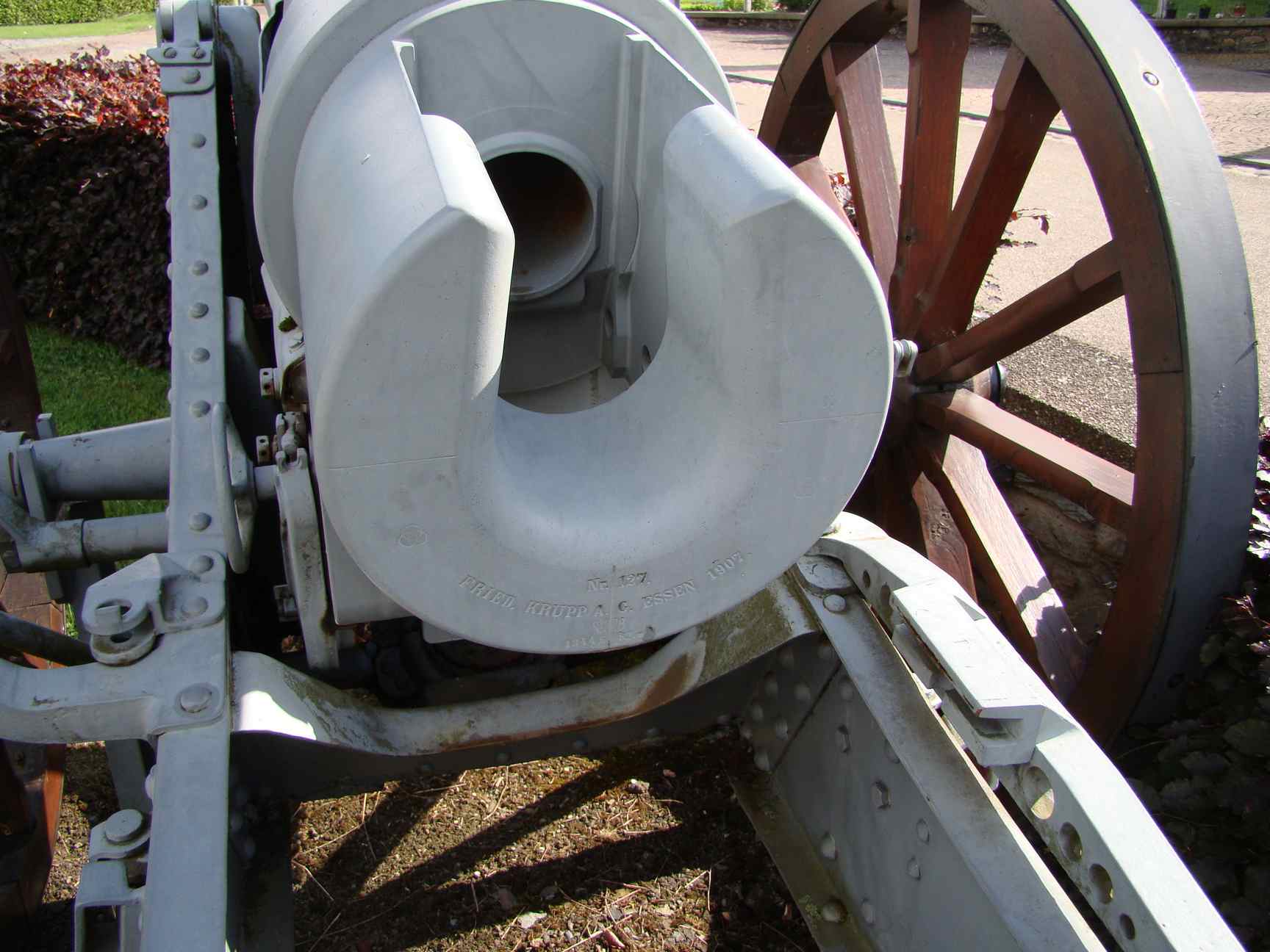 Breech markings 'Nr 127 - 1907 - Fried Krupp AG Essen). The Nr 127 and 243 guns are marked witrh Prussia arms on the tube (with the sentence 'Ultima Ratio Regis') like many pre-war cannons.