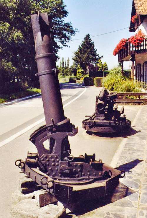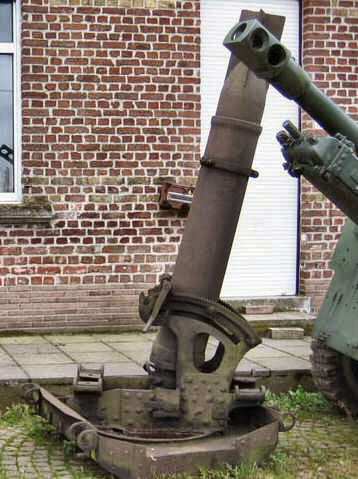The finned tail bomb was entirely inserted inside the tube by its mouth, the propulsive charge being located inside a 150 mm CTR gun used cartridge loaded by the drawer mechanism of the breech. This weapon setup was long and difficult, and the particularly heavy weight the (2600 kg !!) of the materials (steel and wood) needed for building the platform limited its mobility. Weighting more than 3.5 tons, it came in operation in July 1916 and was massively and successfully used during the Somme offensive.