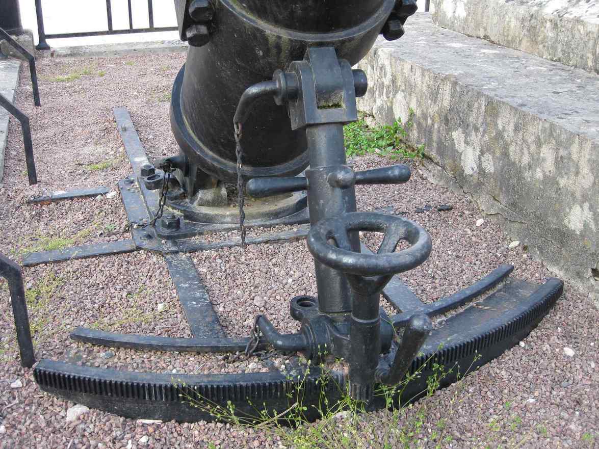 The steel tube was fixed on a carriage composed with an horizontally orientable pivot and a screw mechanism for the vertical aiming, able to slide on a graduated circle arc for the horizontal aiming. The tube and carriage were mounted on a heavy wooden platform made with two crossed beddings (totally 18 thick planks), needed to absorb the shot energy created by the propulsive charge lodged into the powder chamber at the base of the tube.