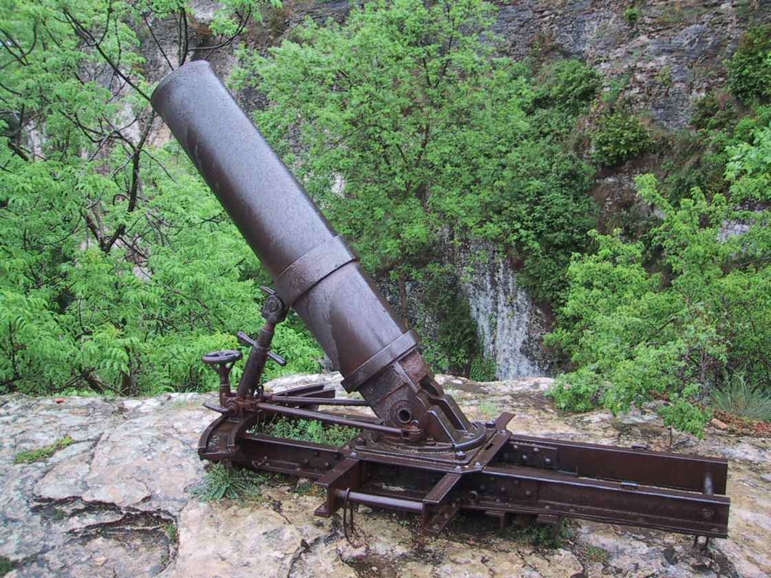 The steel tube was fixed on a carriage composed with an horizontally orientable pivot and a screw mechanism for the vertical aiming, able to slide on a graduated circle arc for the horizontal aiming. The tube and carriage were mounted on a heavy wooden platform made with two crossed beddings (totally 18 thick planks), needed to absorb the shot energy created by the propulsive charge lodged into the powder chamber at the base of the tube.