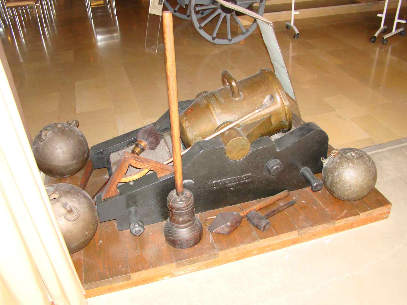 These rustic mortars were composed with a bronze tube with a truncated cone powder chamber (designed by Mr Gomer) and fired through a hole drilled in the barrel metal/ It was linked by two big trunnions to a heavy wooden platform equipped with a rudimentary vertical aiming system (wedge). The weapon could be transported like a stretcher by its servants with long sticks inserted into side cylinders.