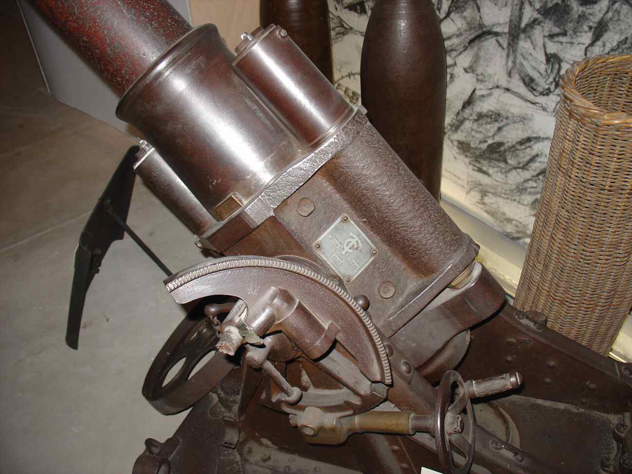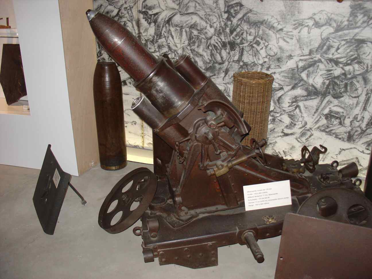 The 175 mm caliber of the '17 cm mMW (a/A)' made by RheinMetall ('mMW' = 'mittlere MinenWerfer' = medium mine launcher) was the intermediate one. It was tested in 1912 and introduced in the army units in 1913, two years after the 25cm sMW a/A heavy mortar.
