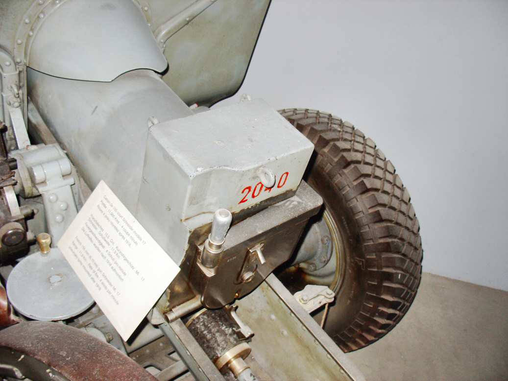 The gun was equipped with a quick manoeuvring Schneider breech of the same model as the one used on the 105 Mle 1913 from the same company. The recoil brake / recuperation system was also similar to the 105 mm gun, with both organs placed side to side below the tube, and the long overhanging craddle. A counter-weight placed above the breech was compensating the lack of balance due to the position of the trunnions at the back of the barrel close to the breech.
