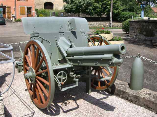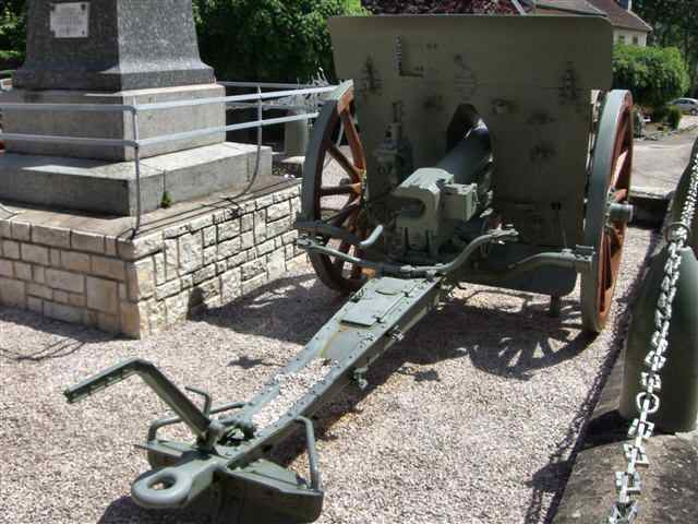Rear view. There are two similar guns around this war memorial. They were brought there after WW2 at the request of a General living in the village' to replace older WW1 German guns taken out by the nazis |