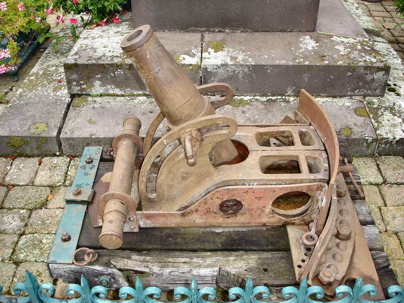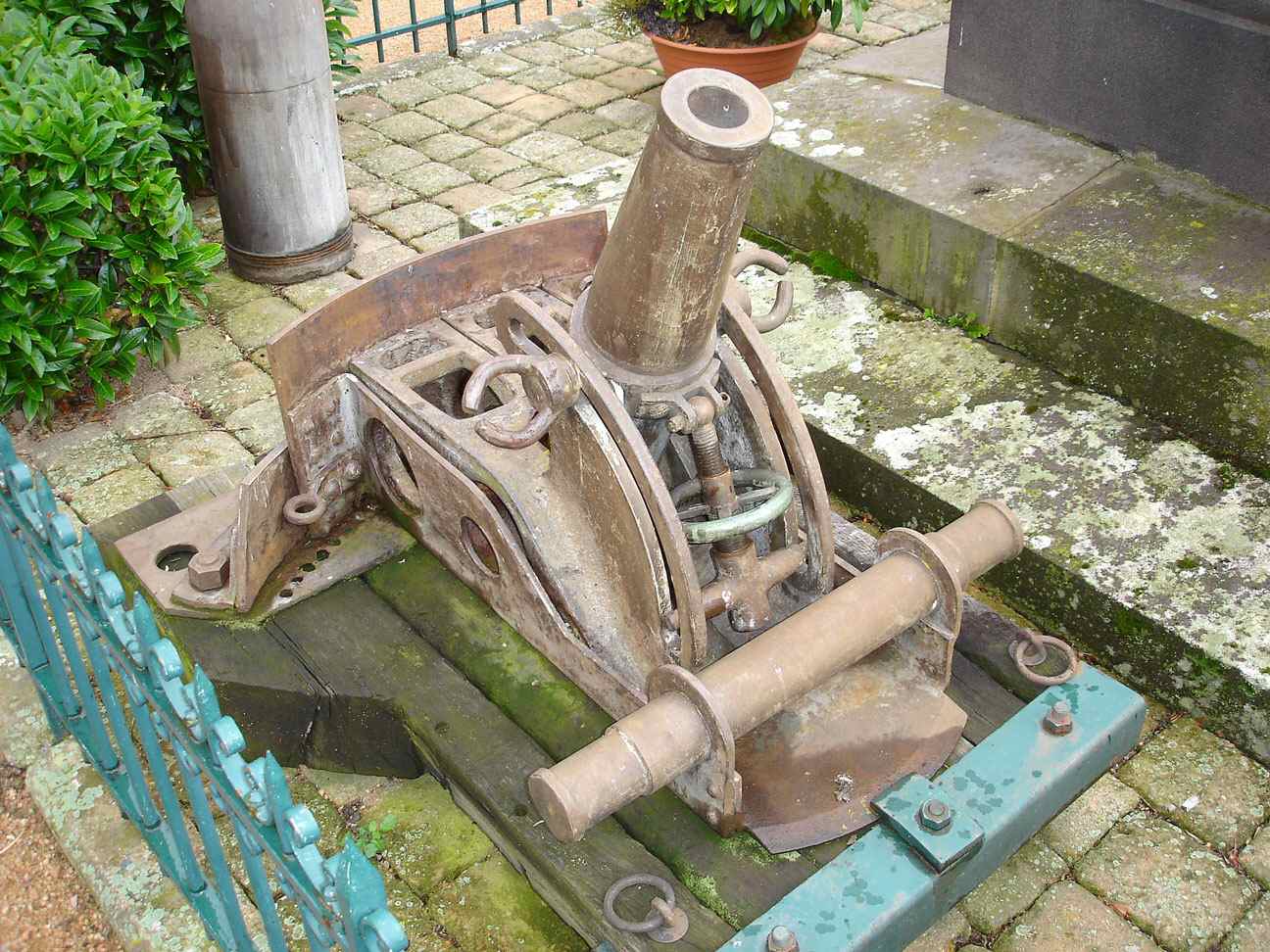 Nice survivor, still monted on its wooden platform. Interesting view on the horizontal aiming system with the sliding curved plates and preset holes