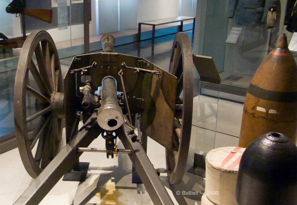 The light 37 mm (1.5 inches) caliber was introduced in the second half of the XIXth century as ship deck gun or landing gun in the Navy of several countries, including the one of France, as well as for close defence guns in fortresses/ The 37 mm Hotchkiss revolver-gun was the most famous representative of this latter category. Some of these light guns were indeed used on the frontline by several fighting nations during the improvisation times of the first months of WW1 and the start of the position war. The marine '37mm Mle 1885 TR' gun has been used as an improvised weapon on the French trenches as soon as the end of 1914, on 'chandelier' carriage or 'wheelbarrow' carriage, sometimes equipped with a Saint Chamond recoil recuperating system..