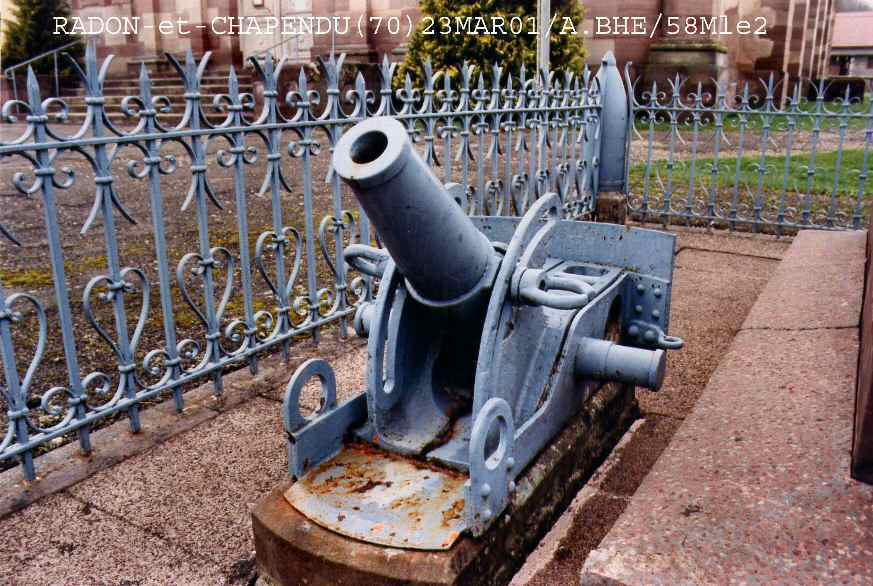 In the Haute-Saône department, if you take the D 6 road from Luxeuil-les-Bains in the direction of Rupt-sur-Moselle, there is a succession of 6 surviving trench mortars 58 T N°2 in the 3.5 km length between the villages of Radon-et-Chapendu and Ste-Marie-en-Chanois