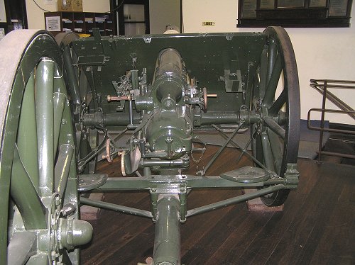 The range issue could only be solved (7132 m) by digging in the tail end into the ground, before it was finally fixed thanks to the substitution of the pole trail with a polygonal one on the Mk IV on Mk III carriage version (that was indeed a brand new gun that only participated in the late battles in small quantities).The Mk I carriage hydro-spring recuperator weakness was fixed during the war by the addition of a oil reservoir box at the front end of the cylinder, then by its substitution with a new hydro-pneumatic system on the Mk II carriage (that gave to the break front end a characteristic torpedo-like shape).