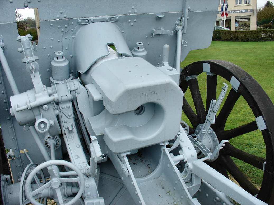 The modernization allowed to shoot the same 42 kg powerful projectile at a distnace increased by 15 %, thanks to a barrel length increase by 2 calibres, a modified carriage and a more complex variable recoil recuperating mechanism, not forgetting the crew steel shield finally installed and proved very useful for counter-battery fire protection. The design also integrated the nice Krupp concept for the barrel balancing : the trunnions linking the recoil recuperation system craddle were pushed back to the rear at the level of the breech. This disposition was giving a higher position to the tube that finally allowed the servants to load the ammos by the breech even when was tube was pointing at high elevation angles. The desequilibrum induced by the trunnions position far away from the center of gravity was compensated by a balancing system.