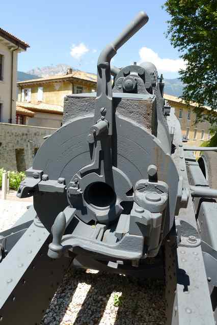 Lateral view. The info we received do not say wether this one gun has been rebored to 155 mm or not, and the breech markings are barely readable