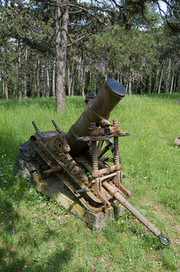 The '22.5 cm MW M15', whose profile was easily recognizable with its two huge frontal screws dedicated to the vertical aiming, was delivered to the armies from June 1915. Appreciated for its simple design as well as for the power of its shells, this smoothbore mortar, muzzle loaded and without any recoil recuperation system was although lacking of precision, and subject to duds (when its bomb landed on its side on soft grounds). It could launch both high explosive shells and gaz shells. For transportation, it was equipped with M99 mountain gun wheels.