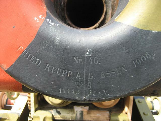 Marquages 'Nr 46 - Fried.Krupp AG - ESSEN 1906 - 8 - 1344,5 kg mV'. This gun is one of the first produced in this mark.