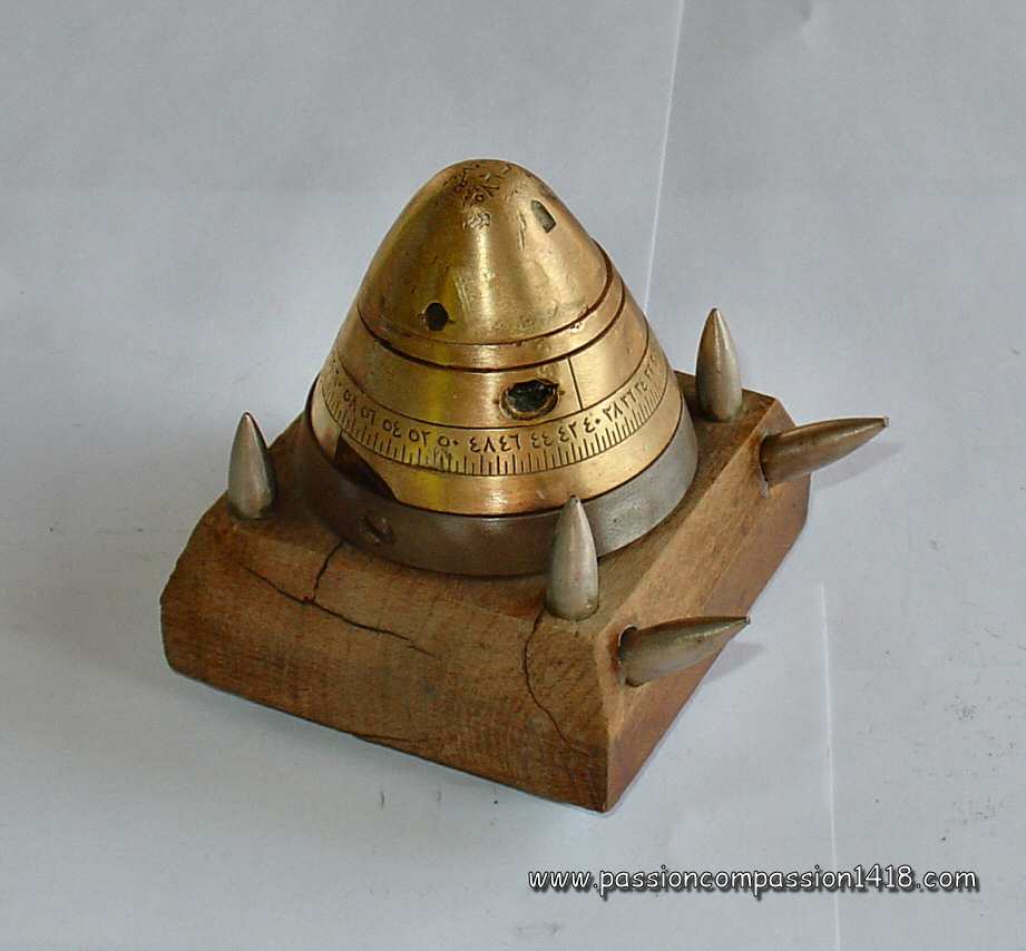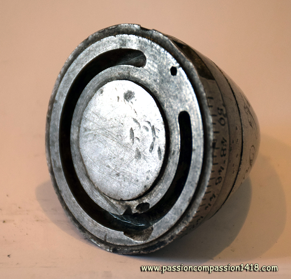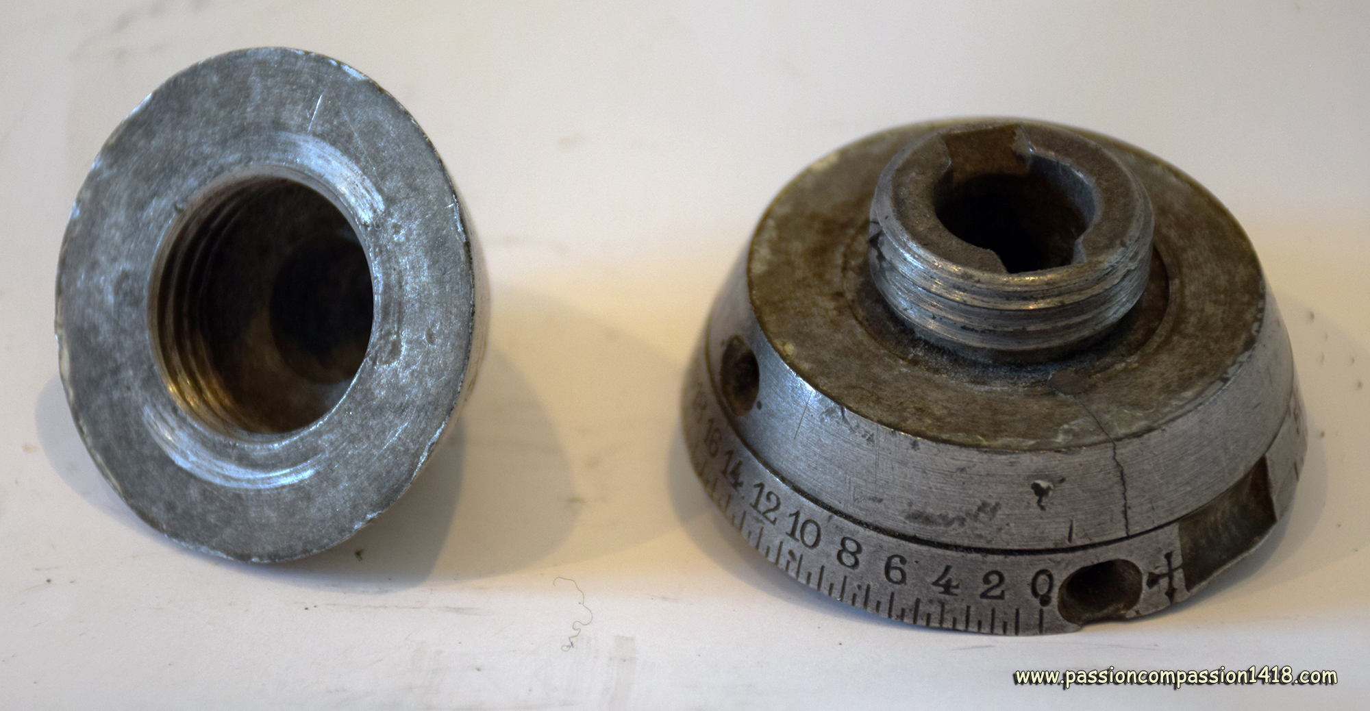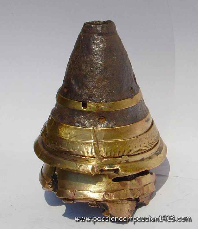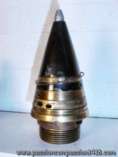 Two different identification hypothesis have been made on specialised forums : an english time fuze modified for intantaneous percussion mode, or a Czech WW2 fuze for 105mm shells. |