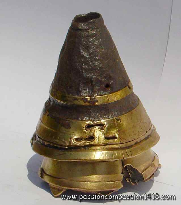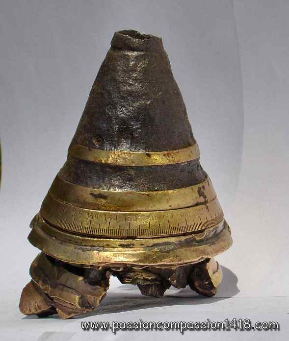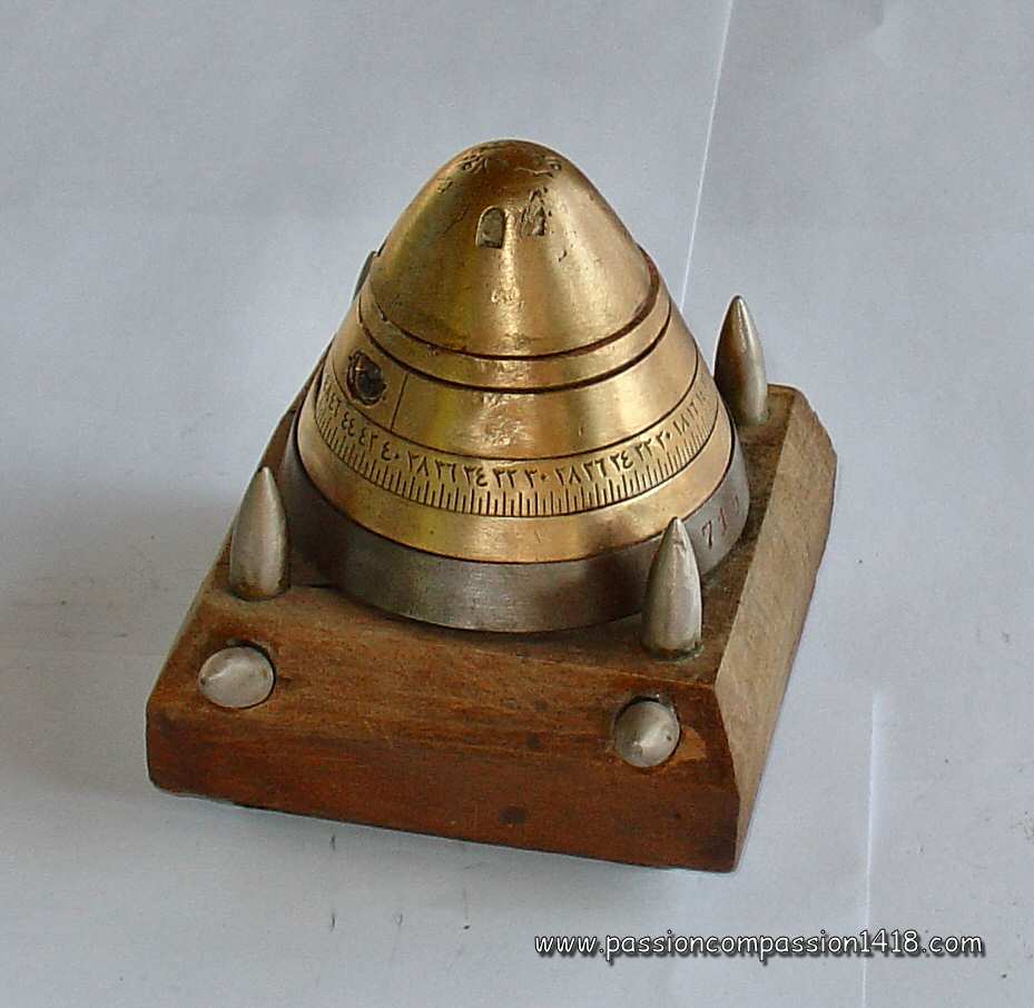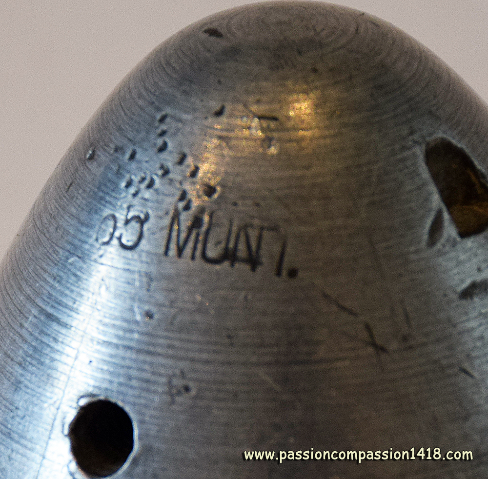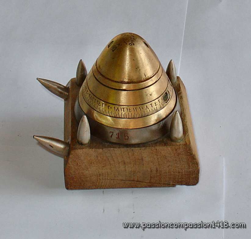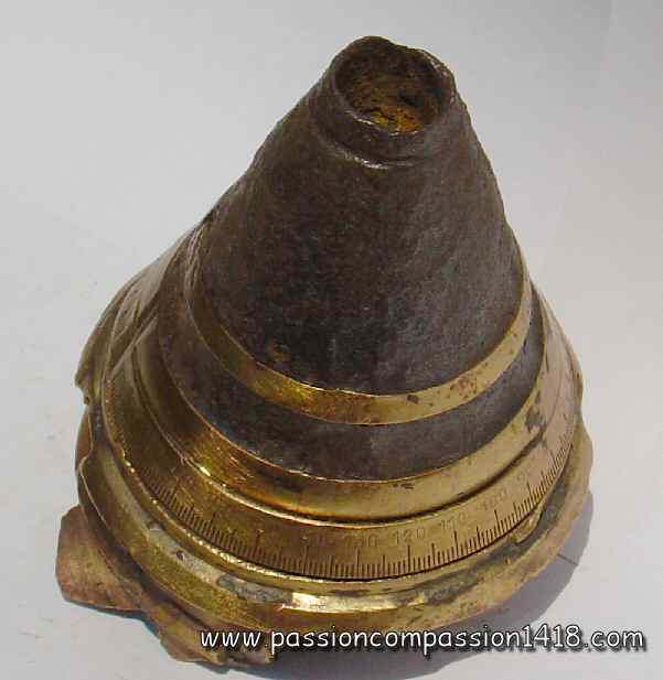 Two different identification hypothesis have been made on specialised forums : an english time fuze modified for intantaneous percussion mode, or a Czech WW2 fuze for 105mm shells. |