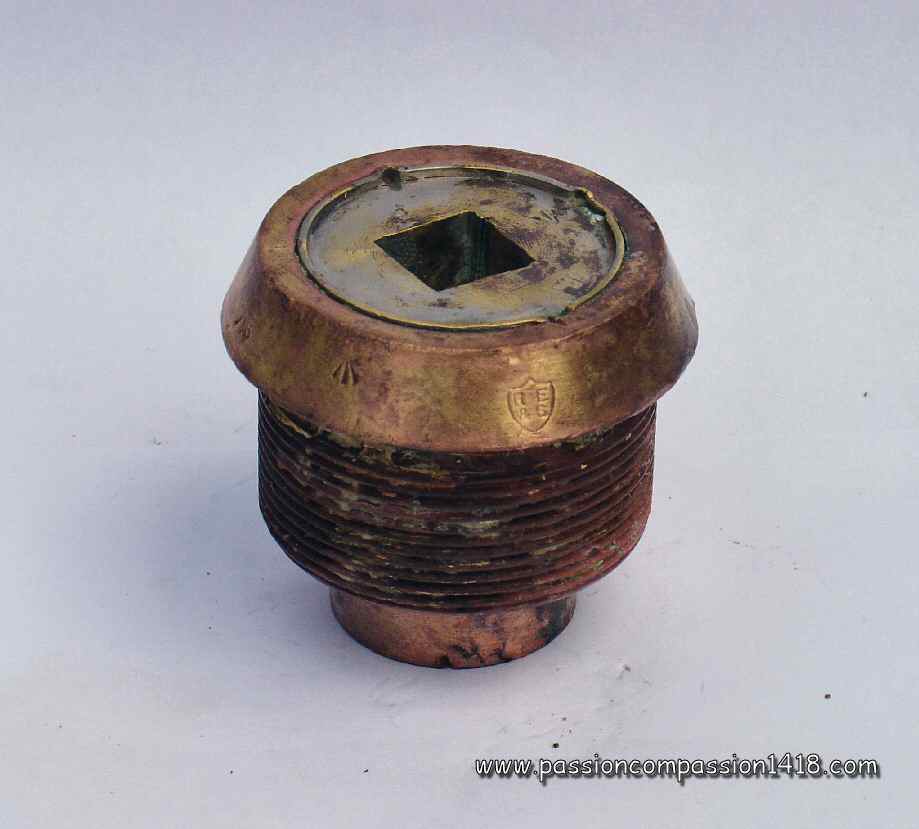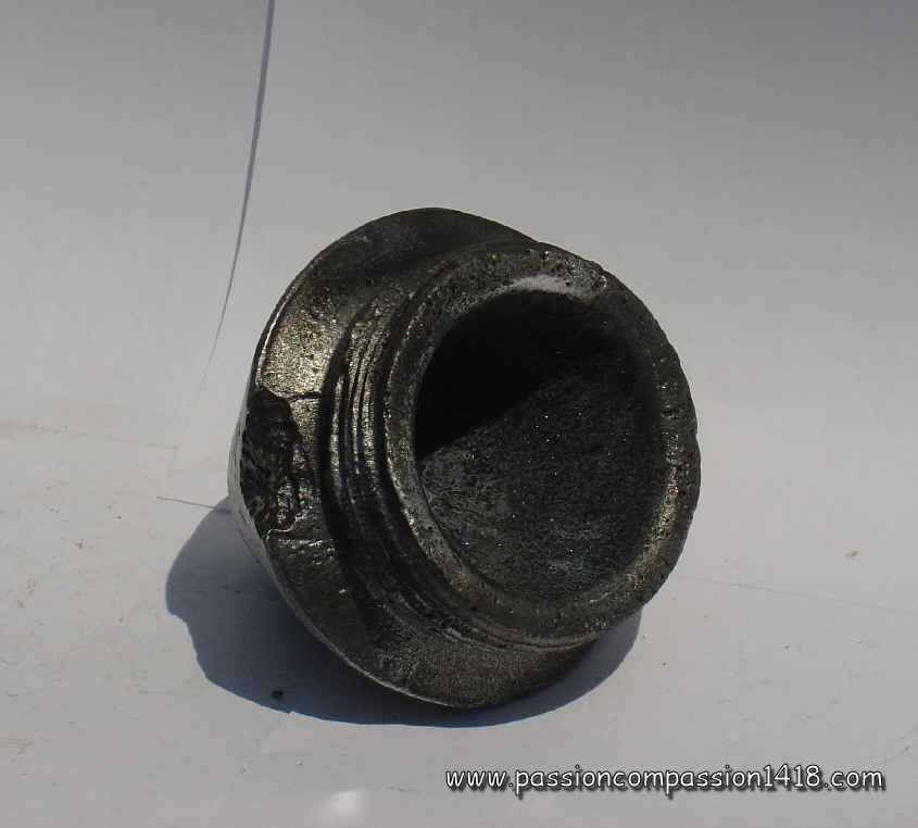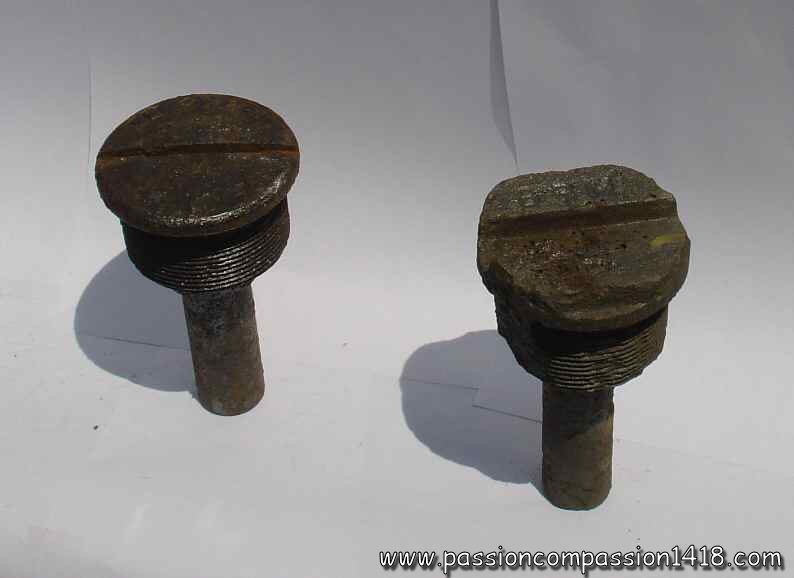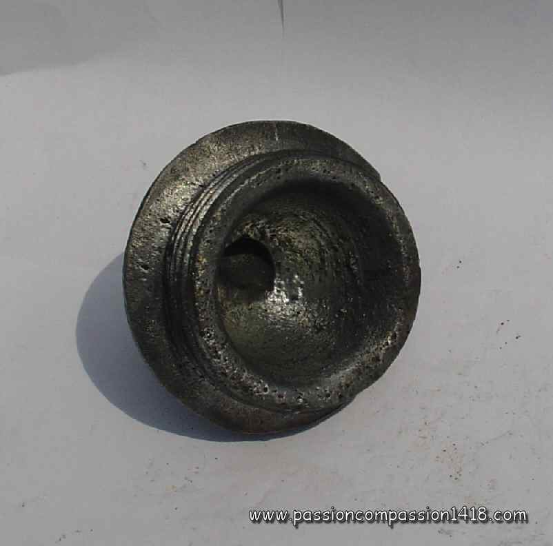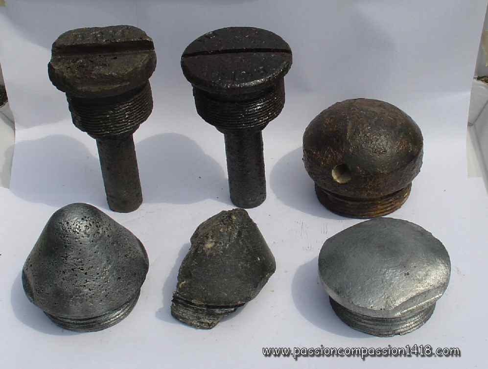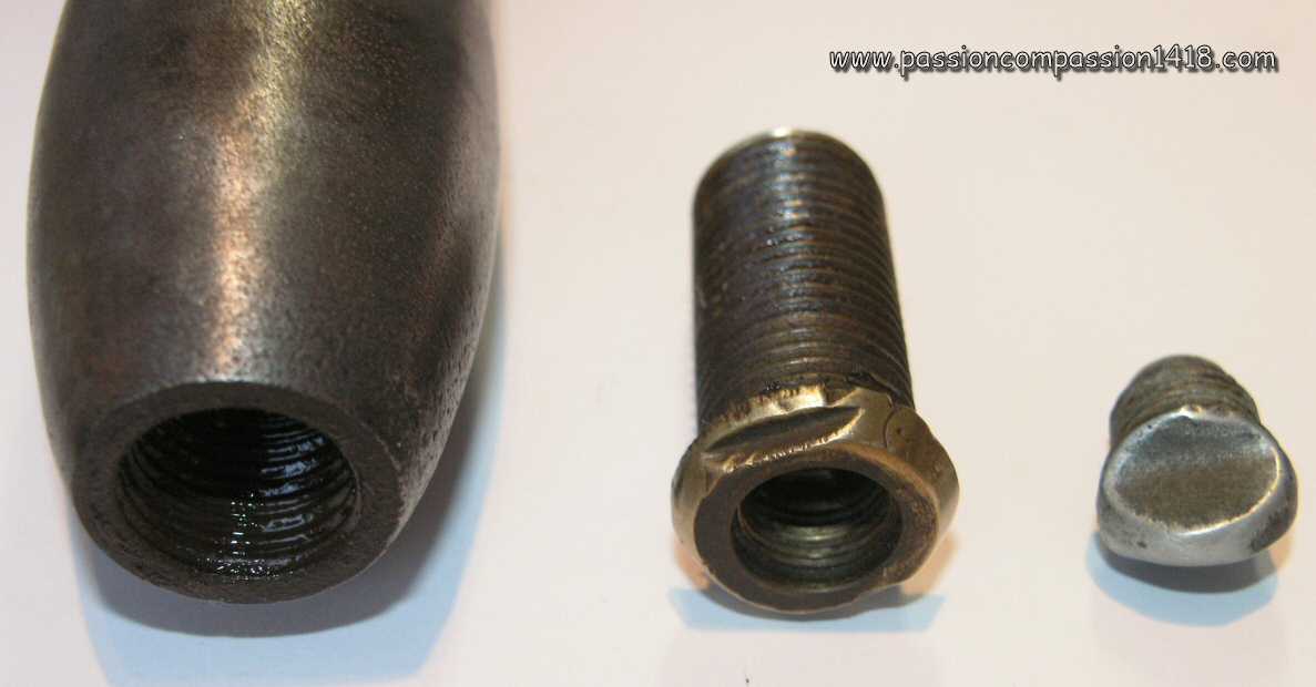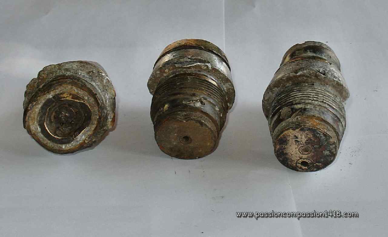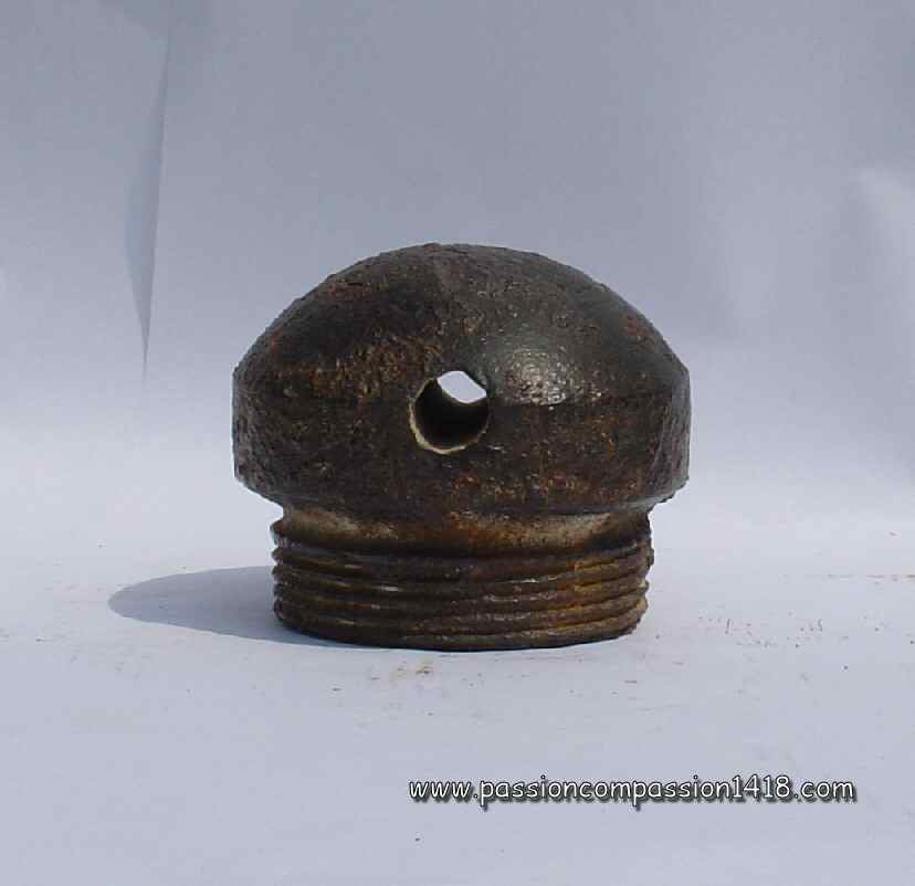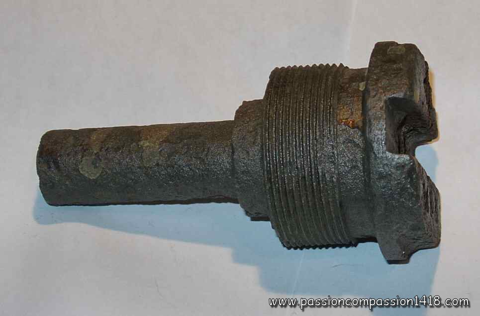 For a long time I thought these pieces were some kind of rear fuzes. But it is in fact very unharmful English plugs. Their shape is made to take the place of the fuze tail and the detonateor in the shell charge. there are several varieties of that plug, with different head markings and shapes. The thread diameter is 50 mm. |